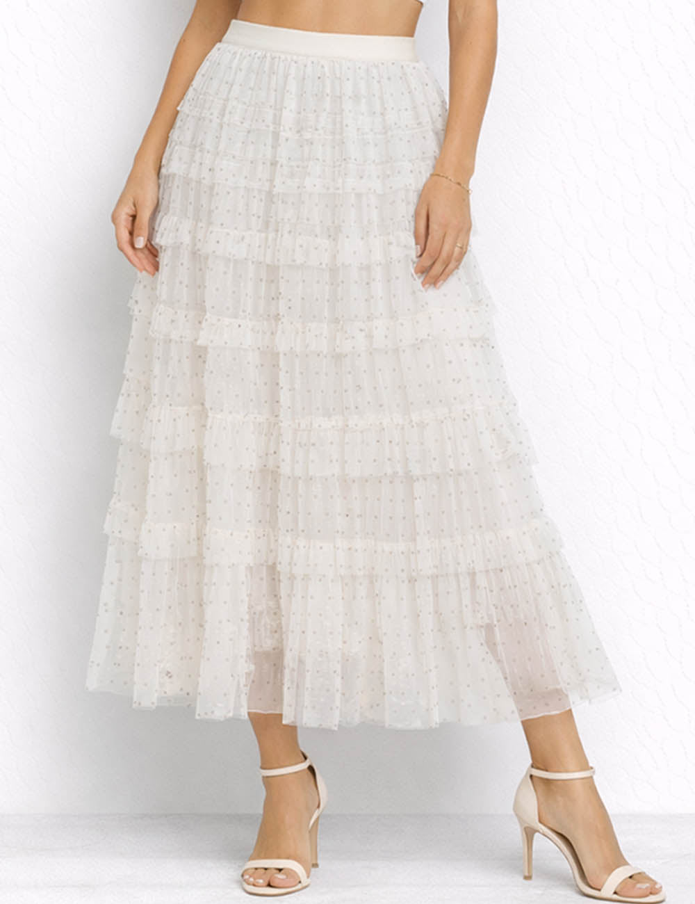 Ladies Elastic Waist Floral Print Mesh Tiered Hem Maxi Skirt