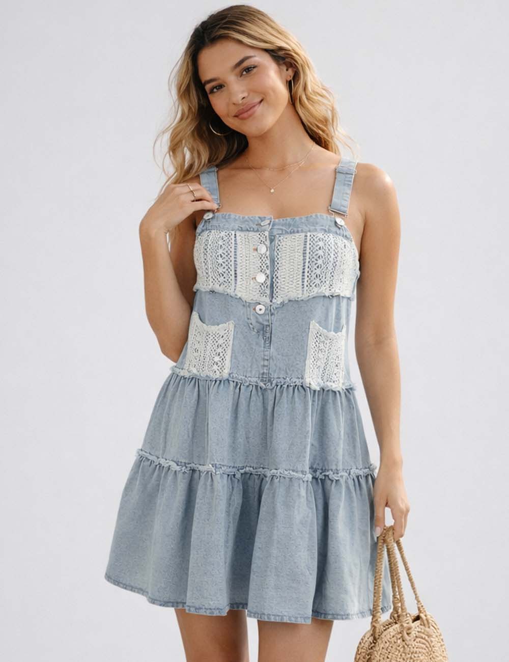 Ladies V-Neck Tie Front Pleated Sleeveless Denim Romper