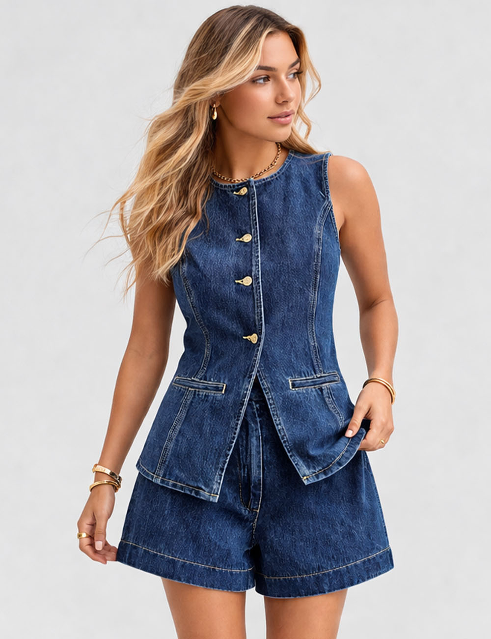Ladies Denim Sleeveless Tank Top and Shorts Sets 16881