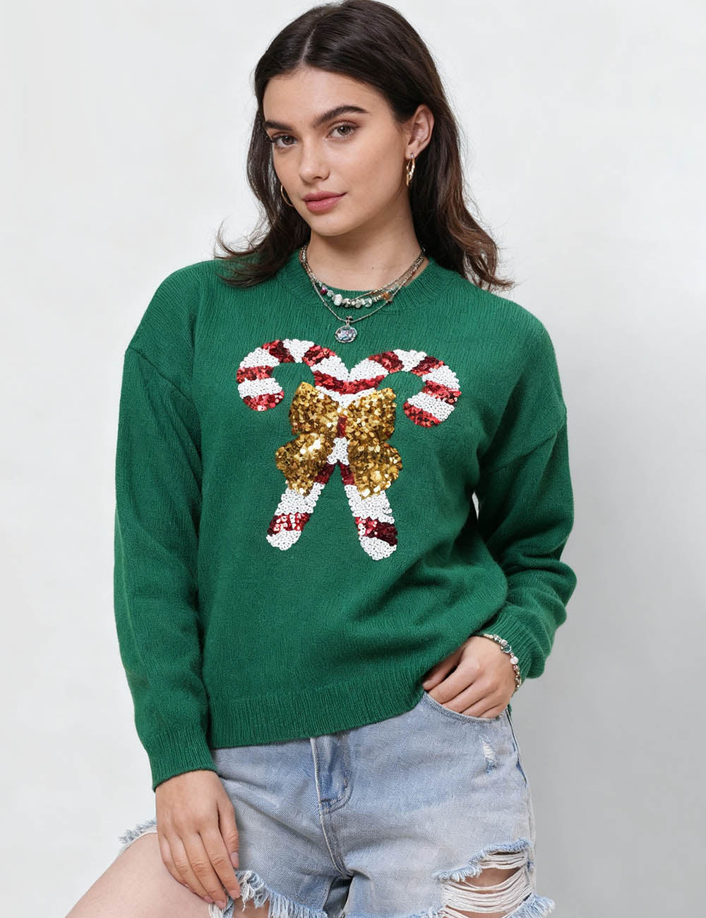 Ladies Christmas Holiday Bow Sequins Candy Cane Pulolover Sweater