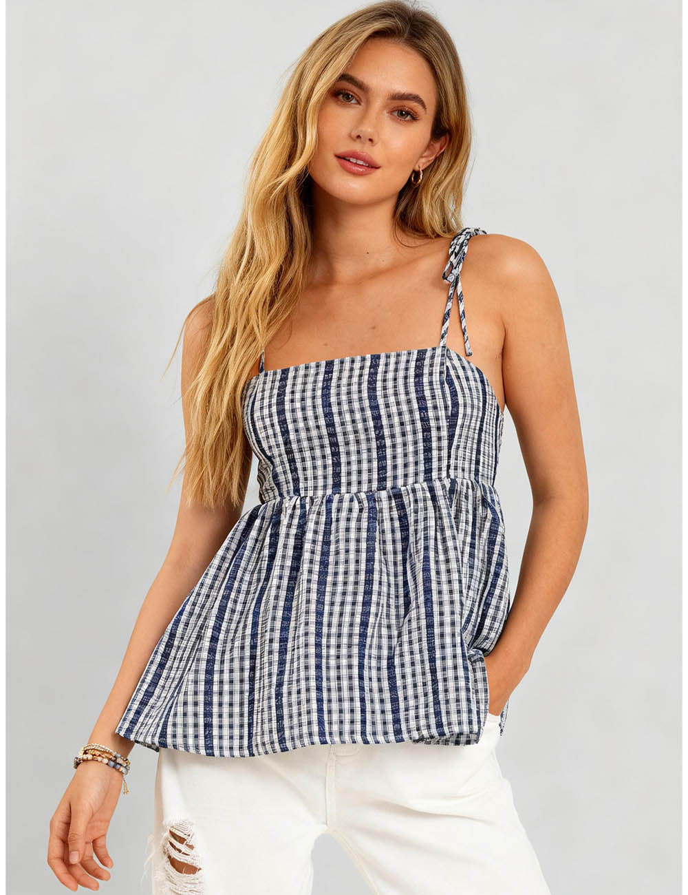 Ladies Color Block Checked Strap Shoulder Tank Top