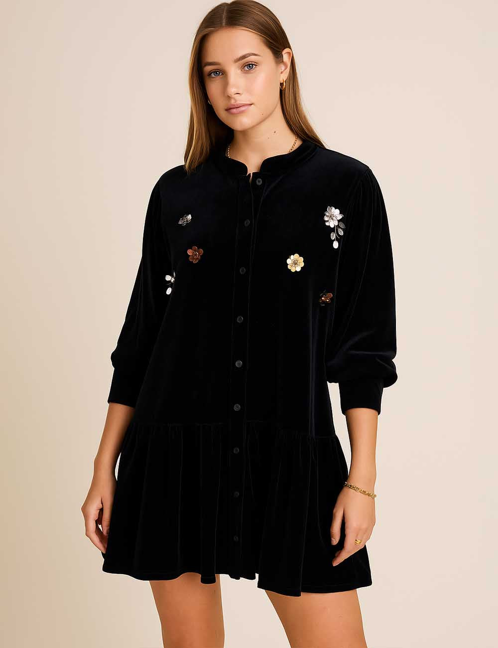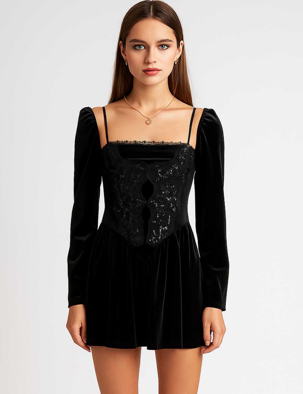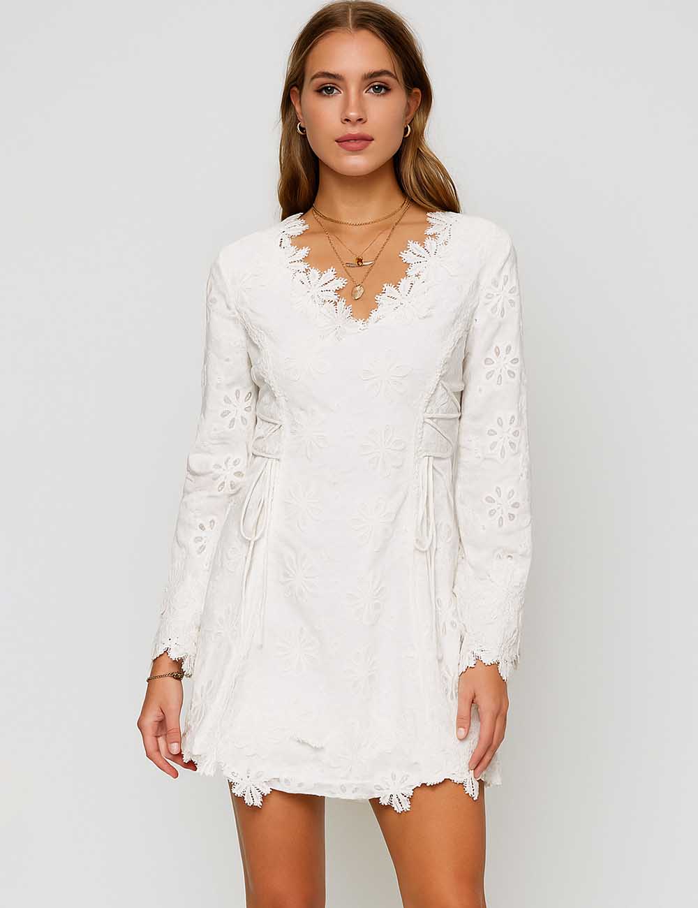 Ladies V-Neck Floral Embroidery Eyelet Long Sleeves Mini Dress