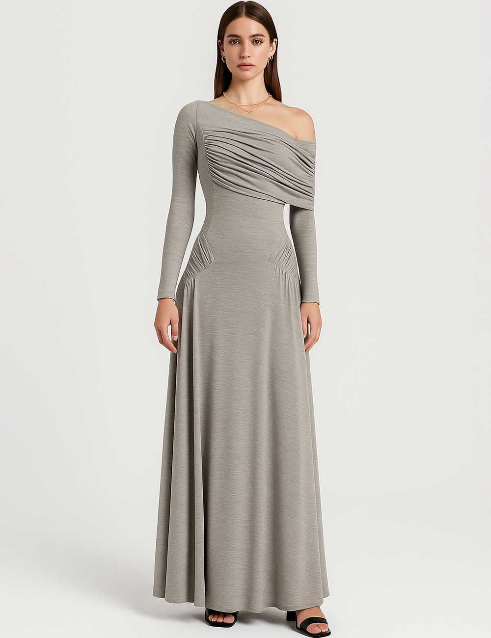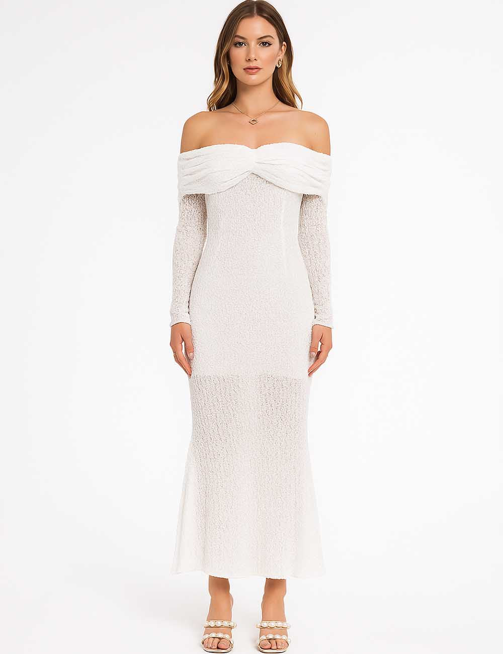 Women Off-Shoulder Solid Color Wrinkle Knit Maxi Dress