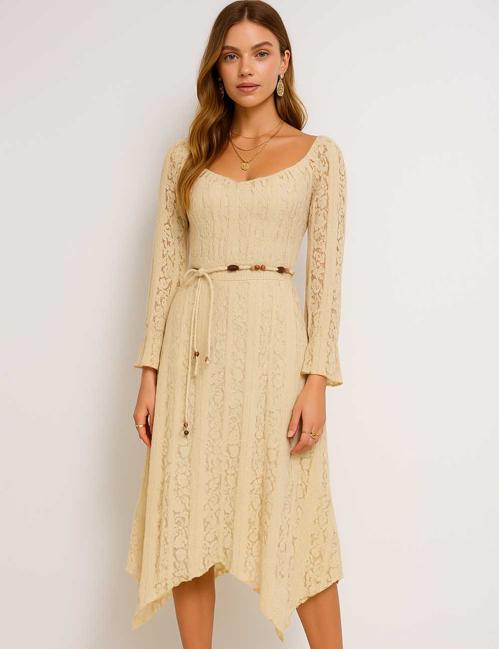 Ladies Mock Neck Eyelet Long Sleeves Midi Dress