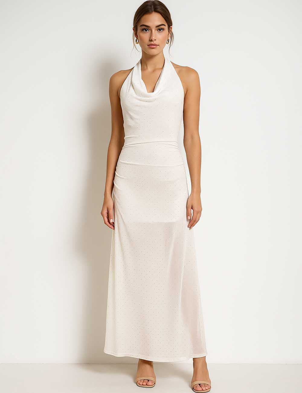 Ladies Rhinestone Halter Cowl Neckline Back Open Maxi Dress