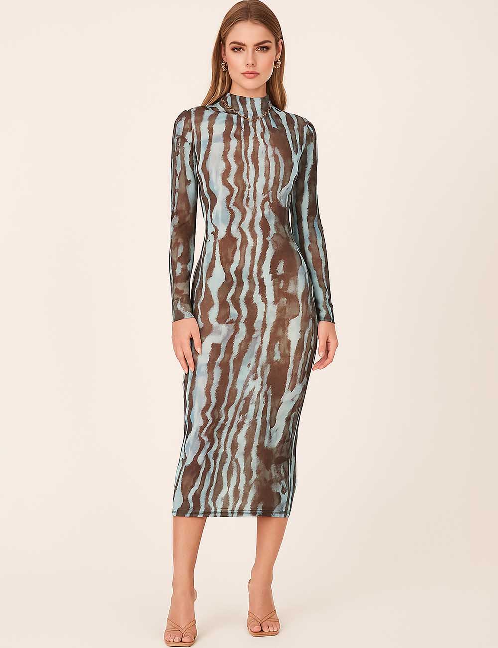 Ladies Striped Print Turtleneck Long Sleeve Maxi Dress
