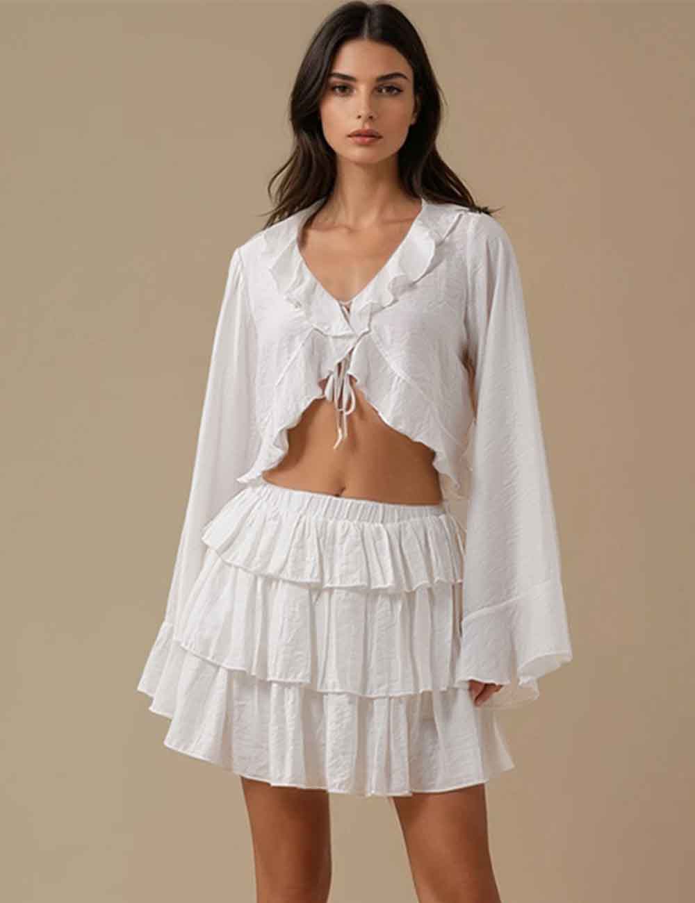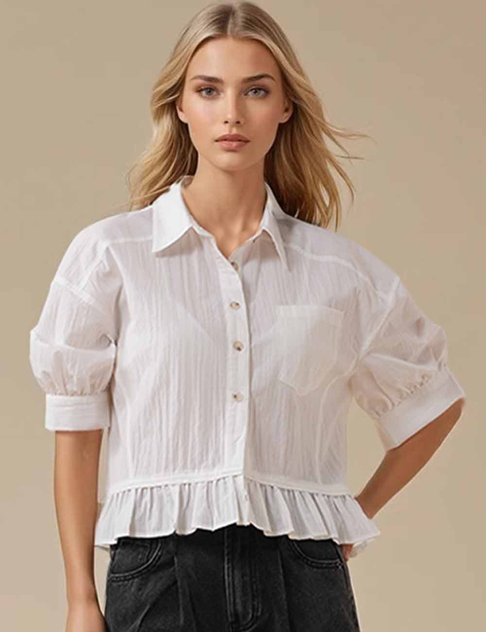 Ladies Solid Color Ruffle String Tie Short Sleeves Top