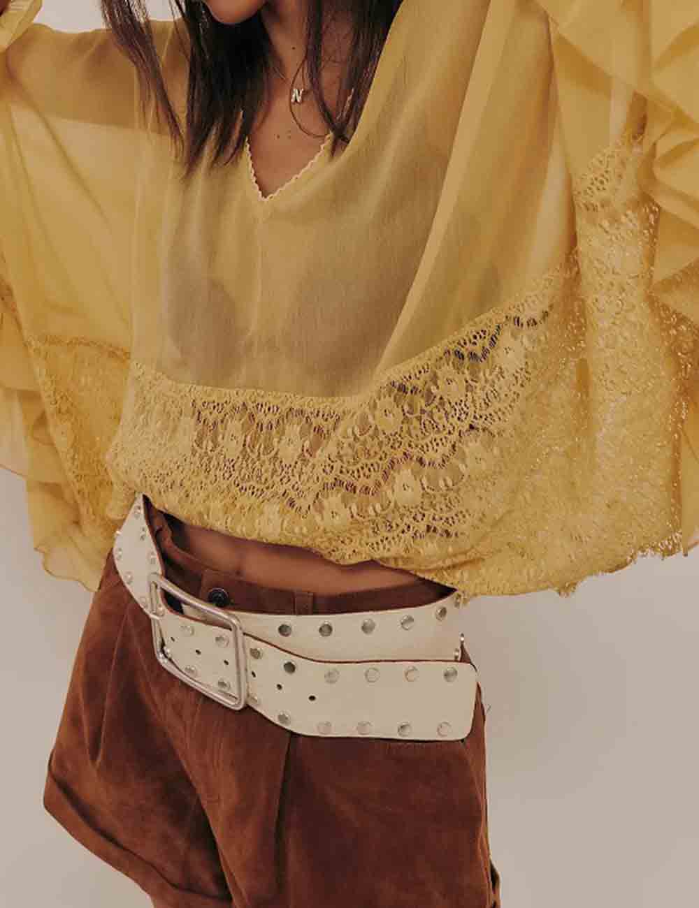 Ladies Lace Ruffle Batwing Sleeves See Through Blouse