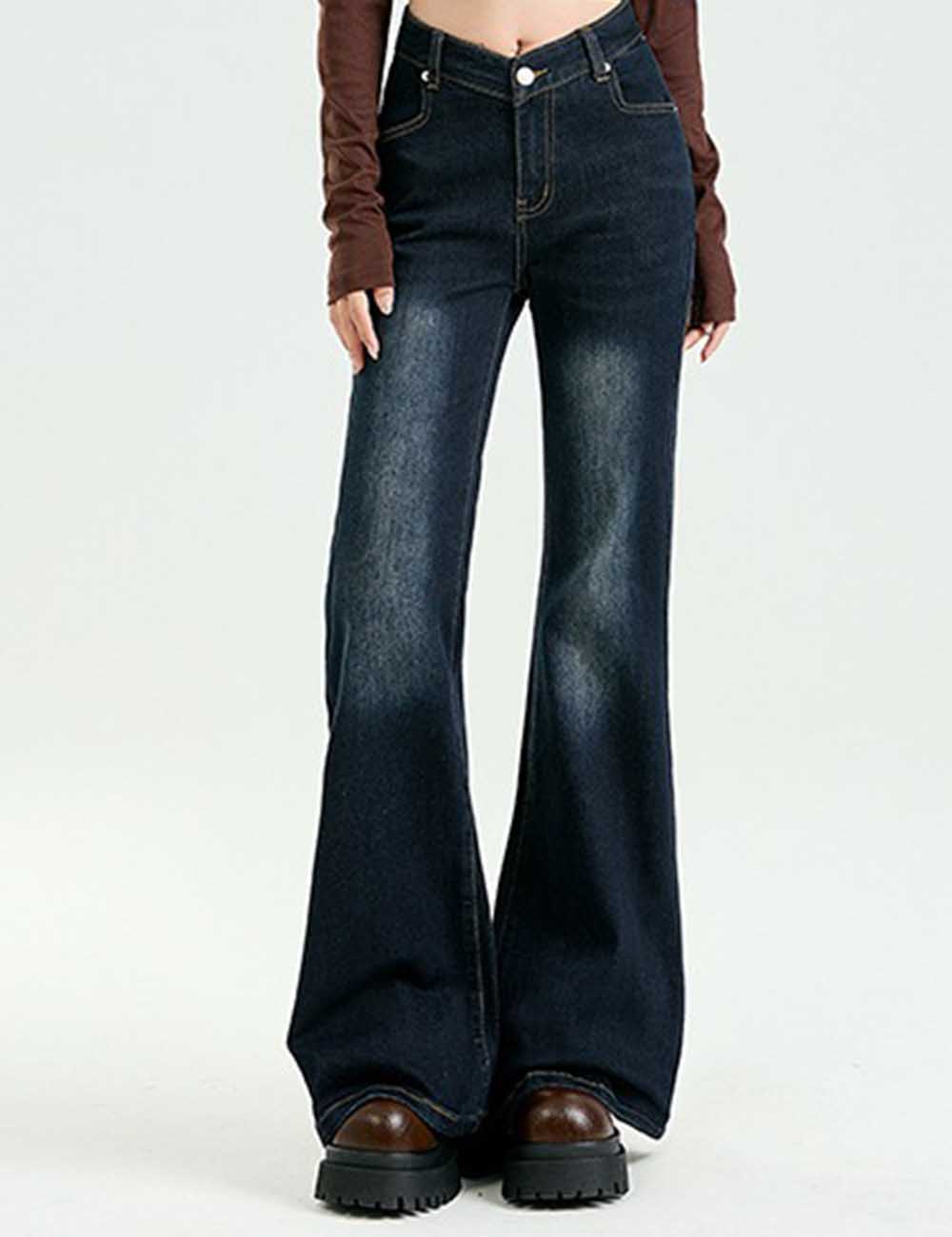 Ladies Distressed Lace Up Button Pocket Flared Denim Pants
