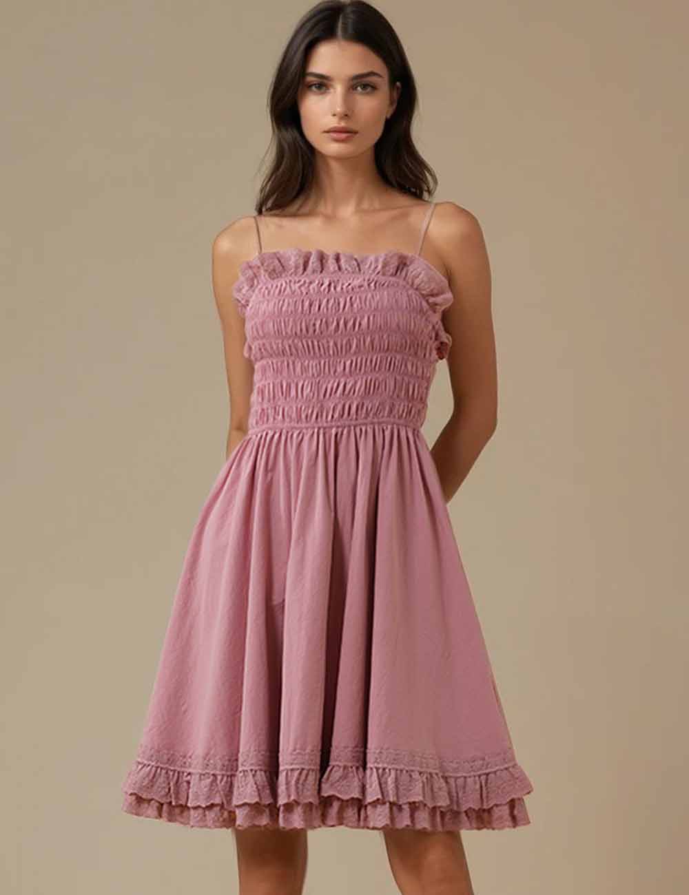 Ladies Solid Color Sleeveless String Shoulder Ruffle Mini Dress