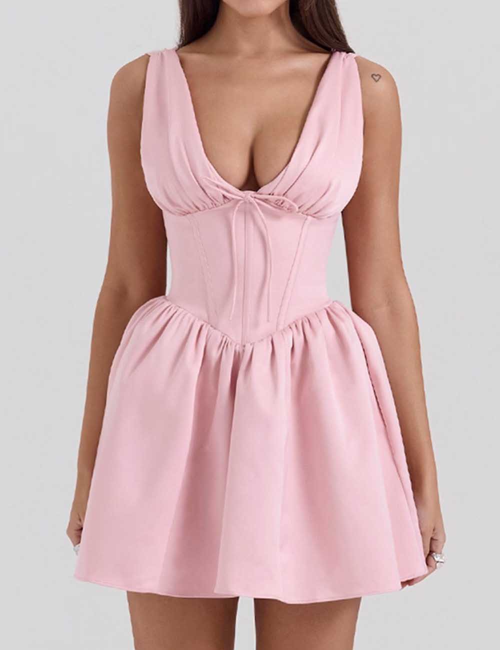 Ladies Solid Color Deep V-Neck Sleeveless Puff MiniĀ Dress