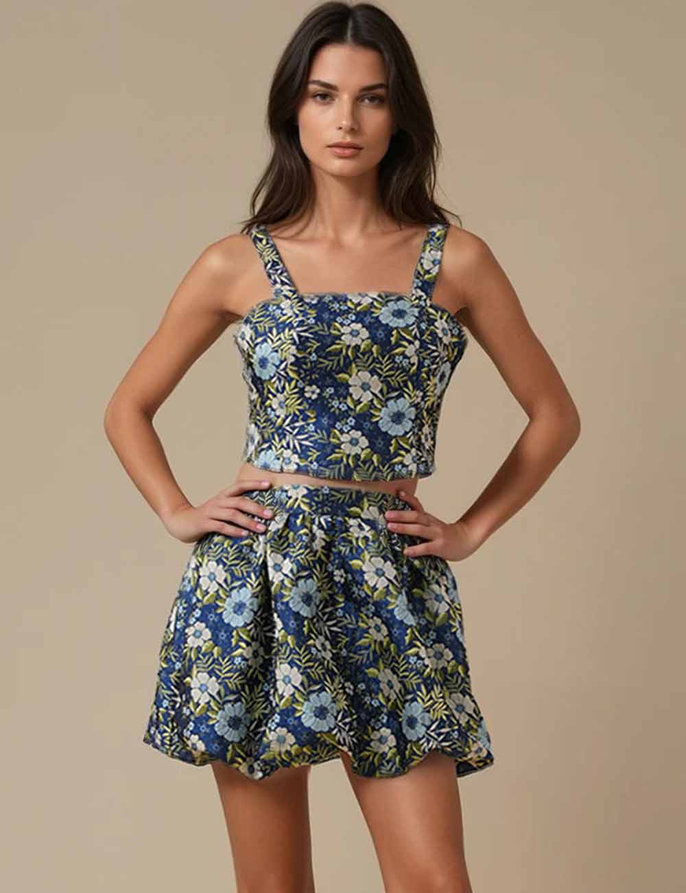Ladies Multicolor Floral Pattern Sleeves Puff Tank Top & Skirt Set