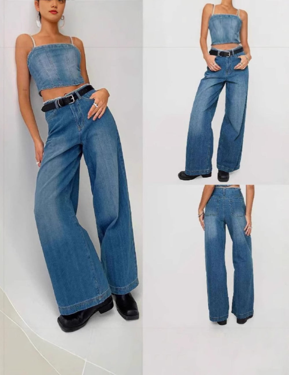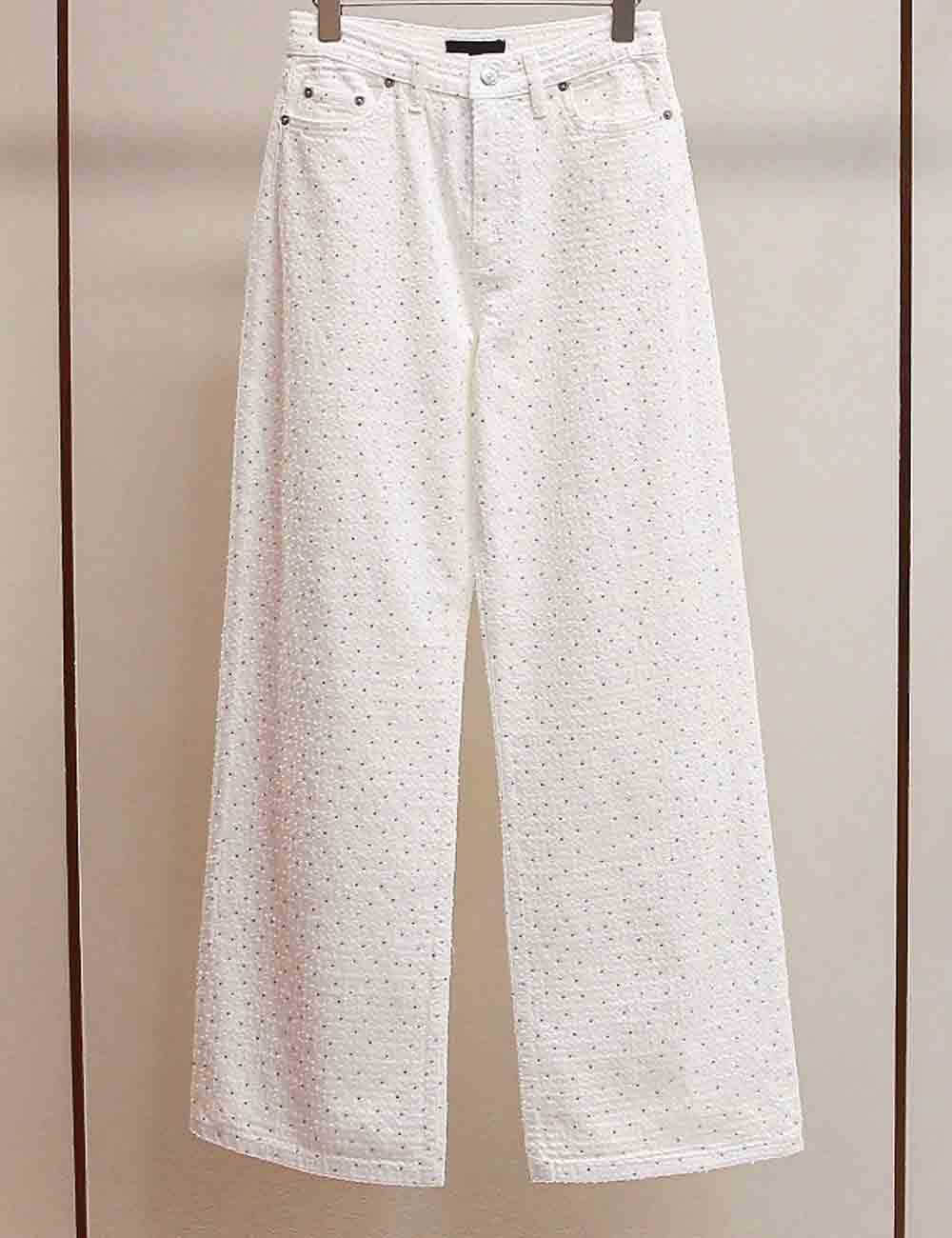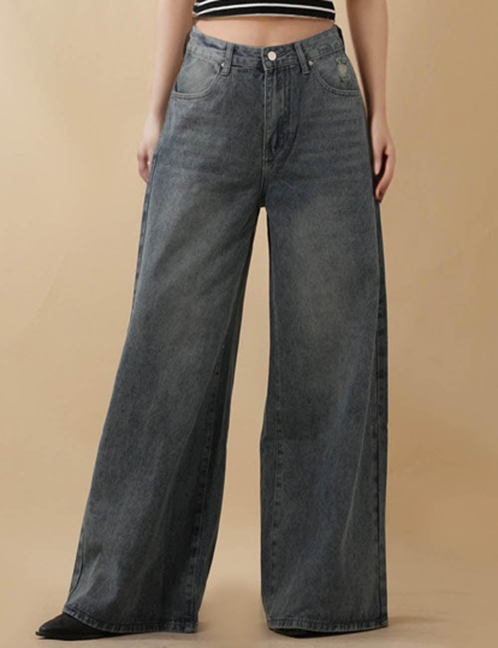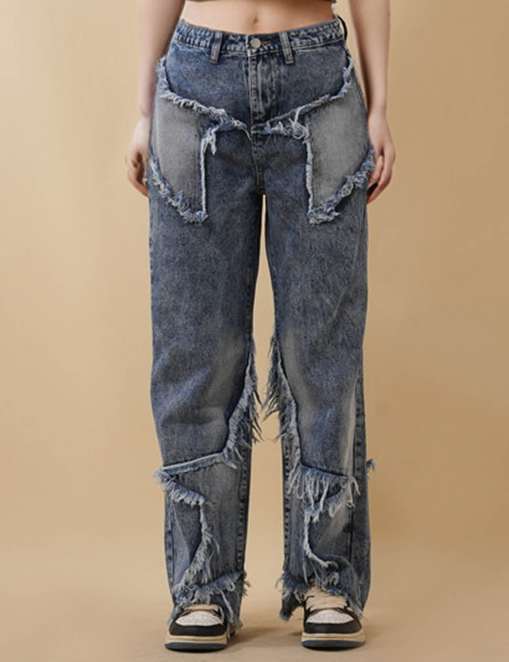 Ladies Distressed Jeans Patchwork Pentagram Wide Leg Denim Pants