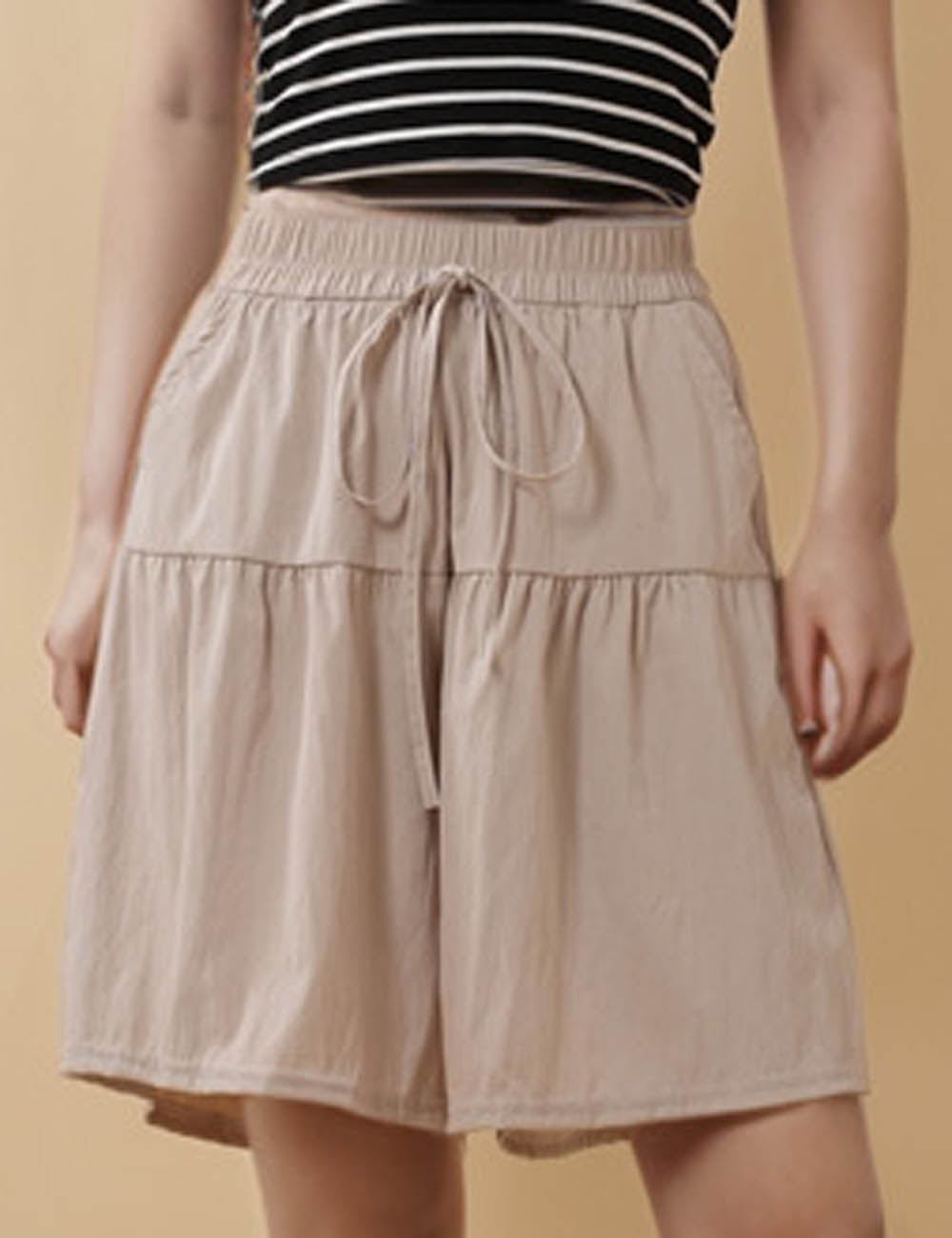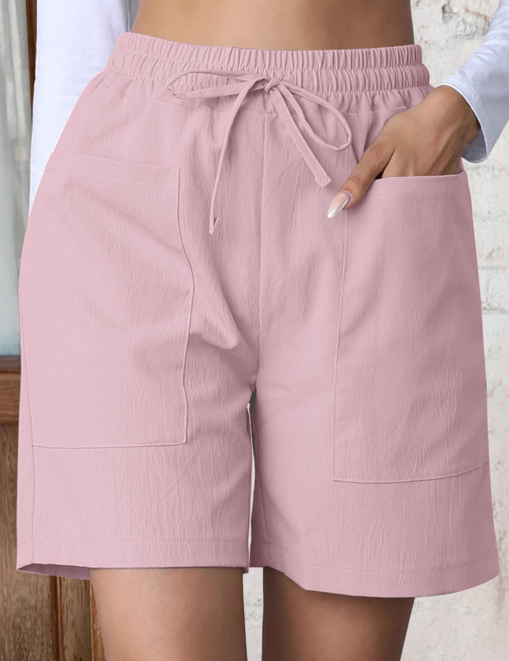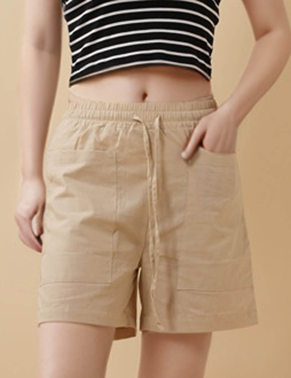 Ladies Solid Color String Tie Pocket Straight Leg Shorts