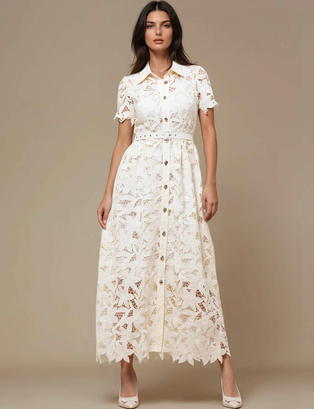 Ladies Elegant Turn Down Collar Short Sleeves Hollow Out Midi Dress