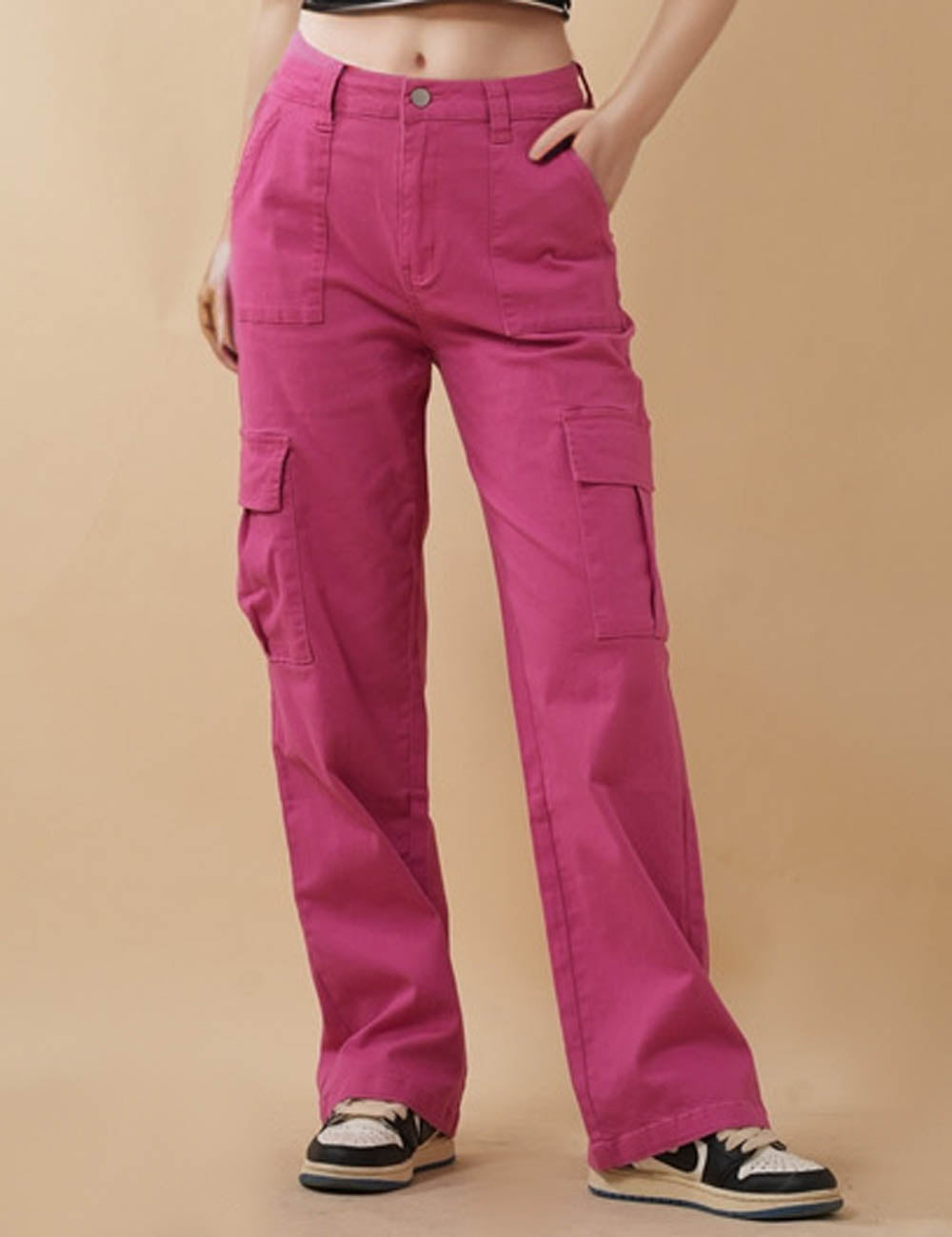 Ladies Cargo Jeans Button Pocket Straight Leg Denim Pants