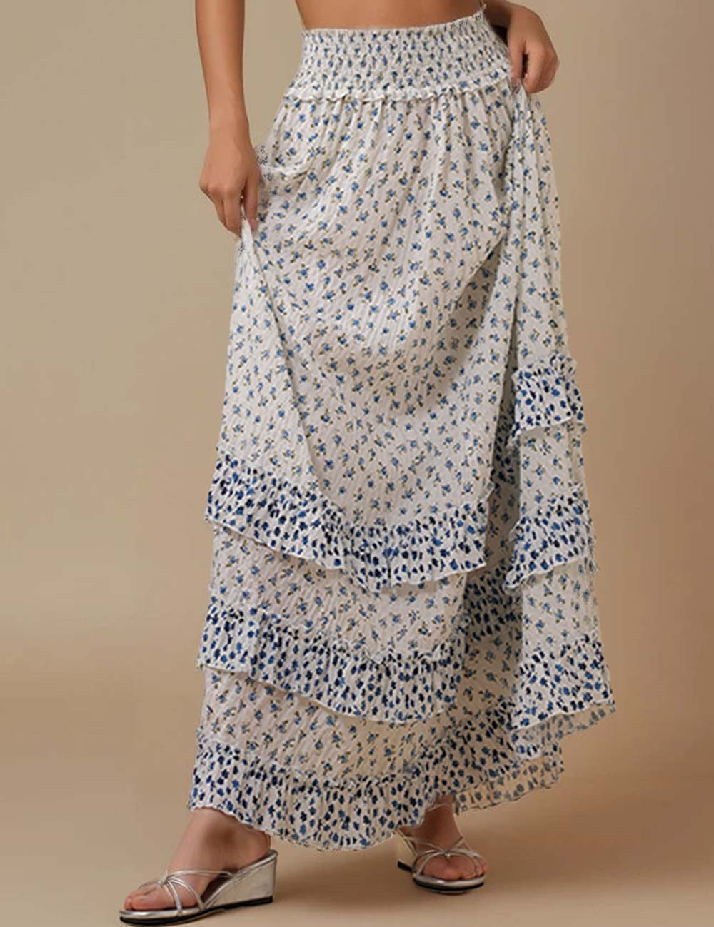 Ladies Color Block Floral Print Ruffle Smocking Maxi Skirt