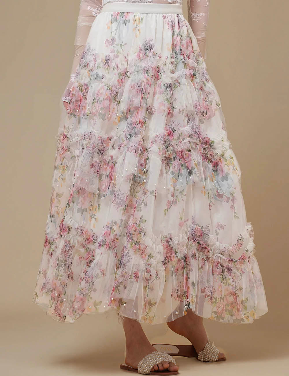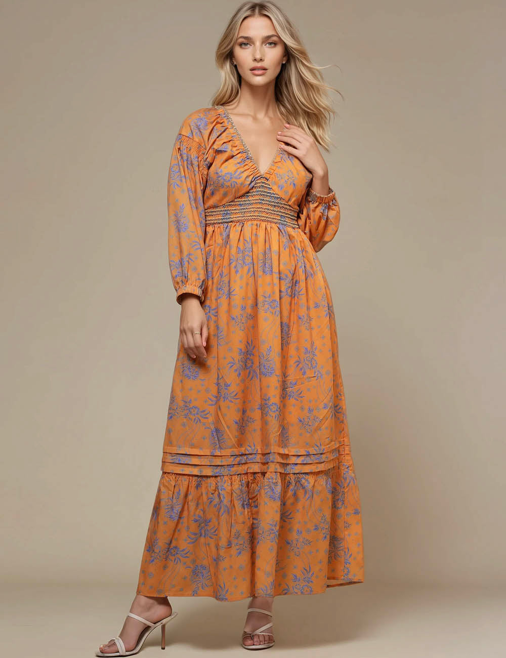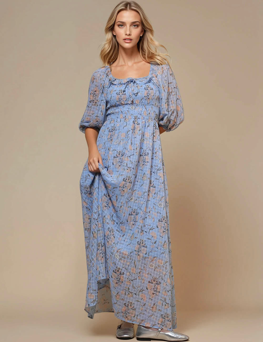 Ladies V-Neck Bubble Sleeves Floral Maxi Dress SKD50414