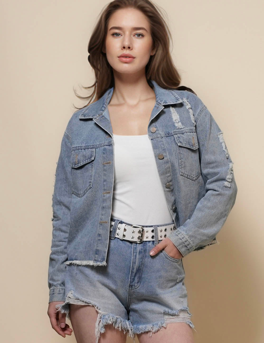 Ladies Turndown Neck Back Star Denim Jacket SKT50022