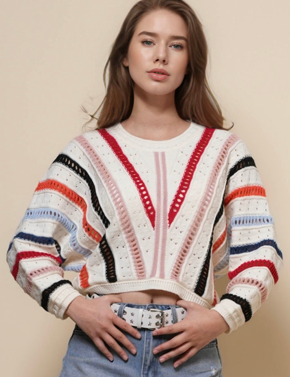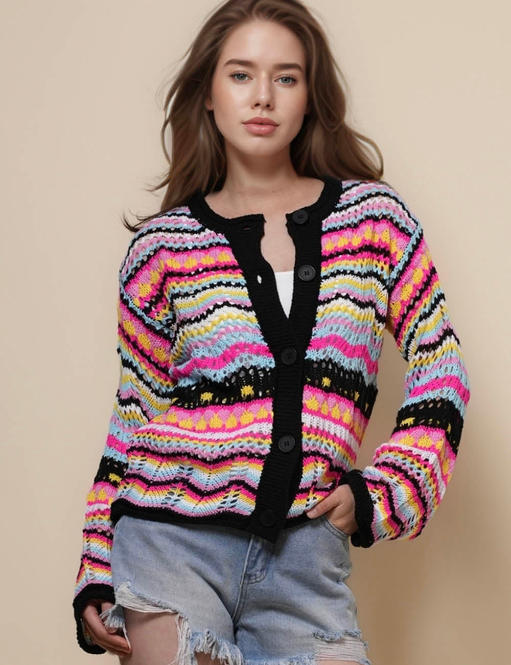 Ladies Multi Color Striped Knit Hollow Out Cardigan SKT50159