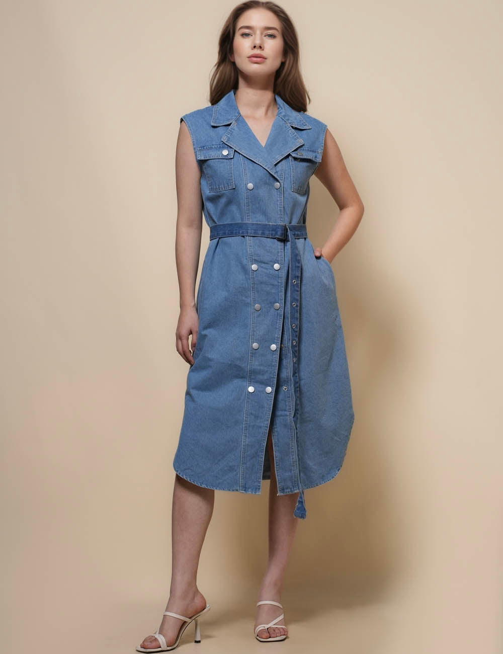 Ladies Turndown Collar Sleeveless Denim Midi Dress SKD50038