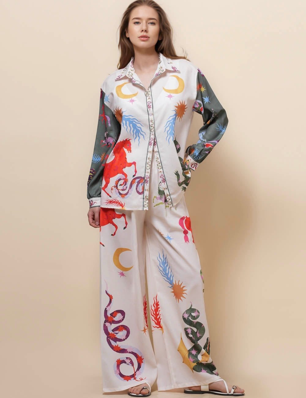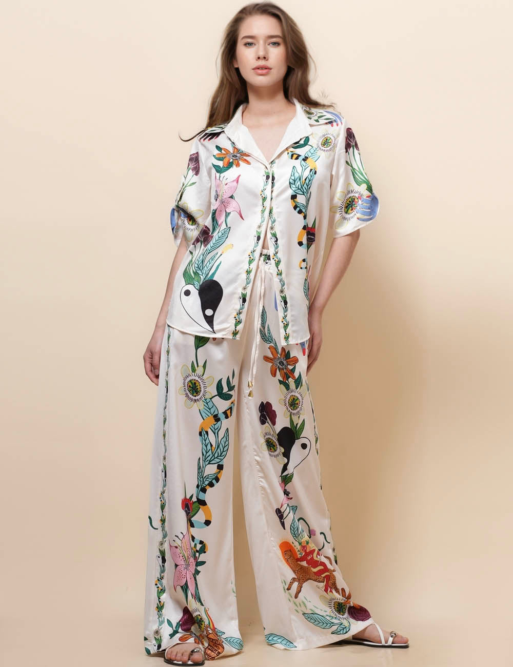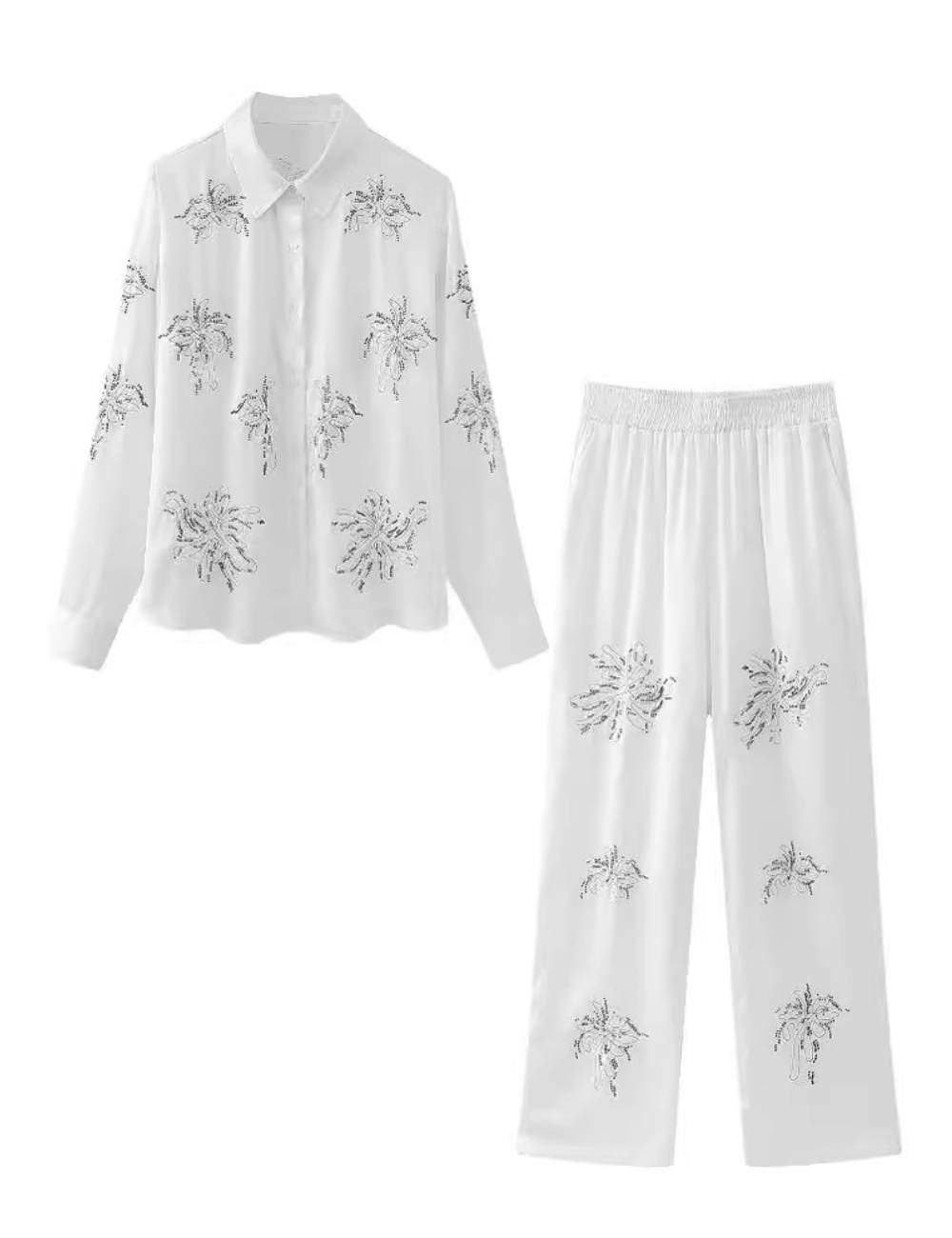 Ladies Beads Flower Shirt with Pants 2PCS Set SKST50352