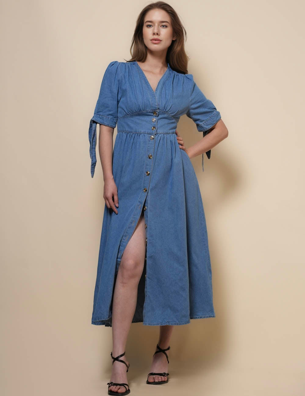 Ladies V-Neck Midi Sleeves String Tie Denim Midi Dresss SKD50036
