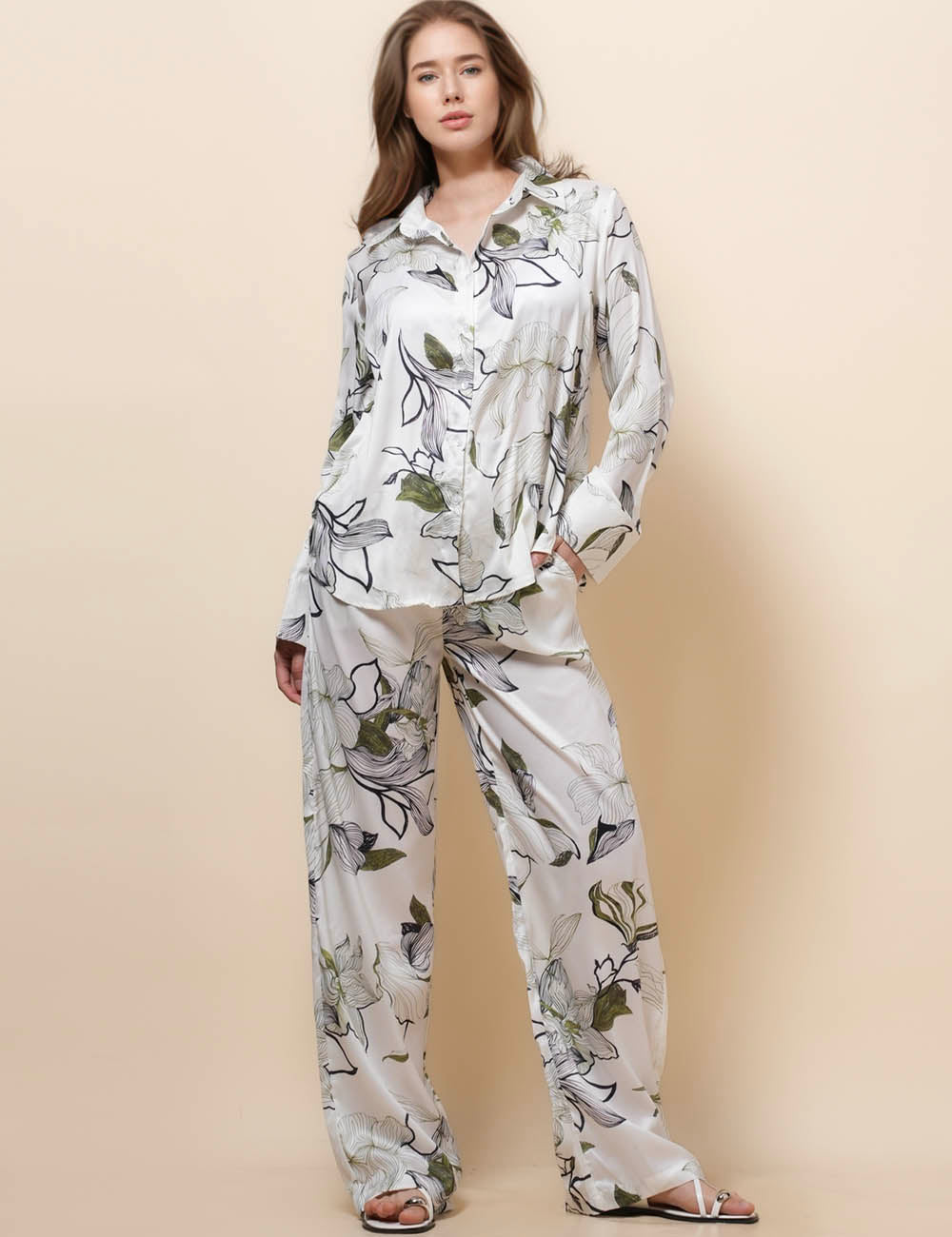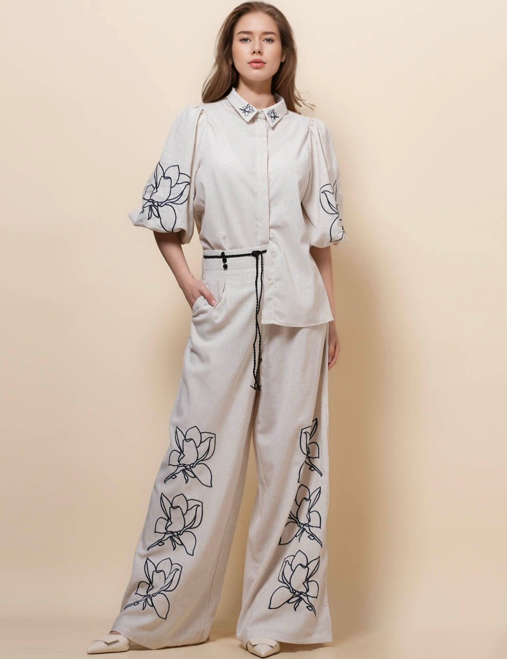 Ladies Puff Sleeves Floral Embroidery Shirt Pants Set SKST50380