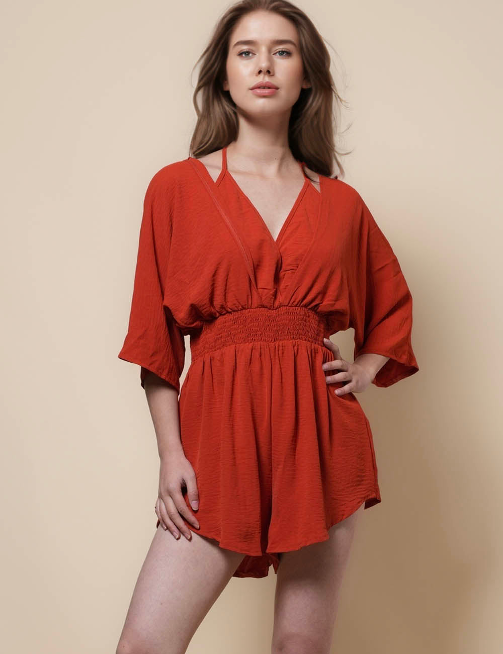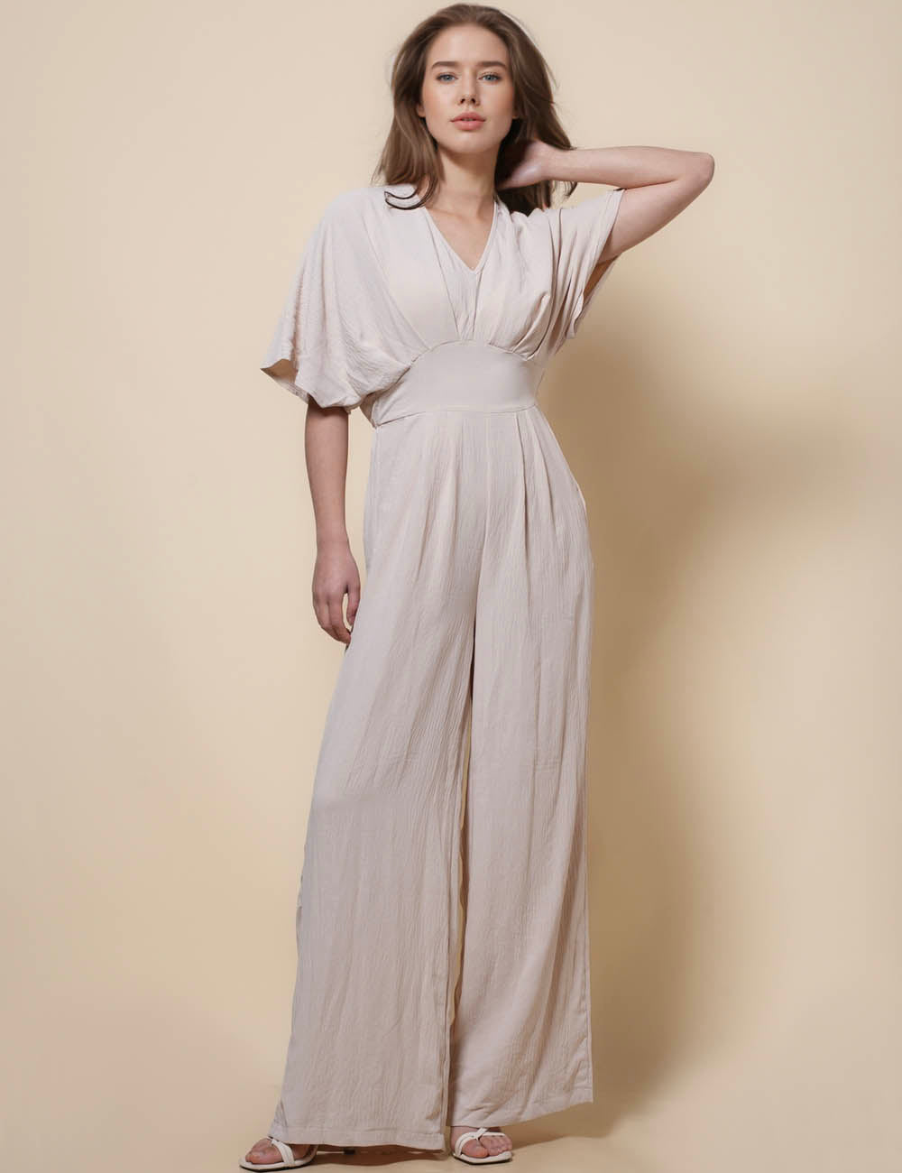 Ladies V-Neck Mid Sleeves Wide Leg Jumpsuit SKJ41276