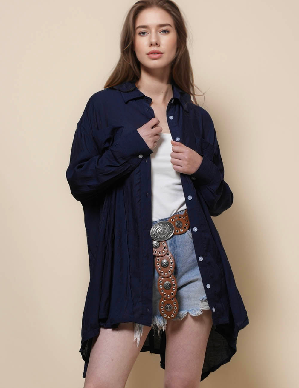 Ladies Turndown Collar Botton Down Mini Shirt Dress SKD41300