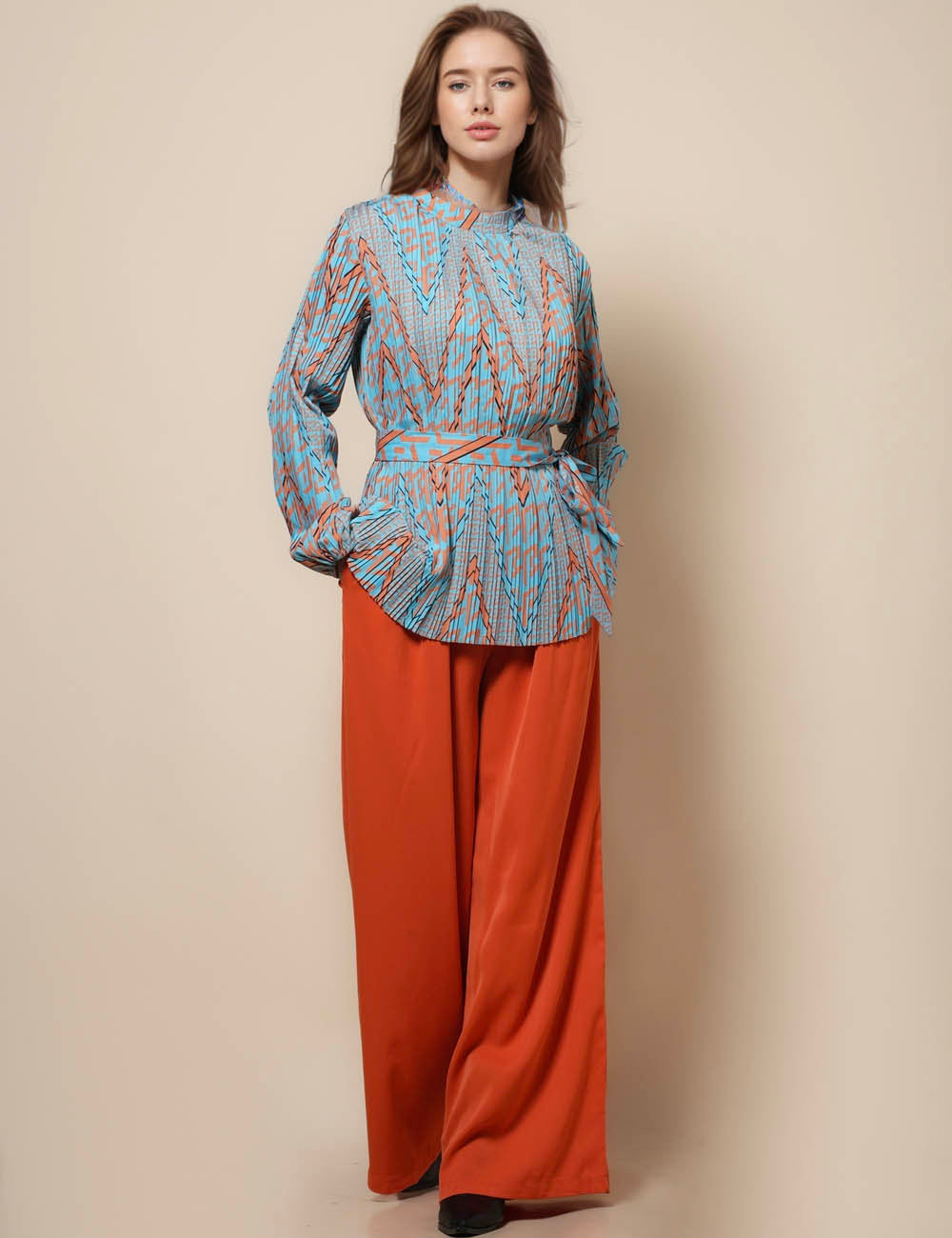 Ladies Round Neck Long Sleeves Button Down Blouse SKT41293