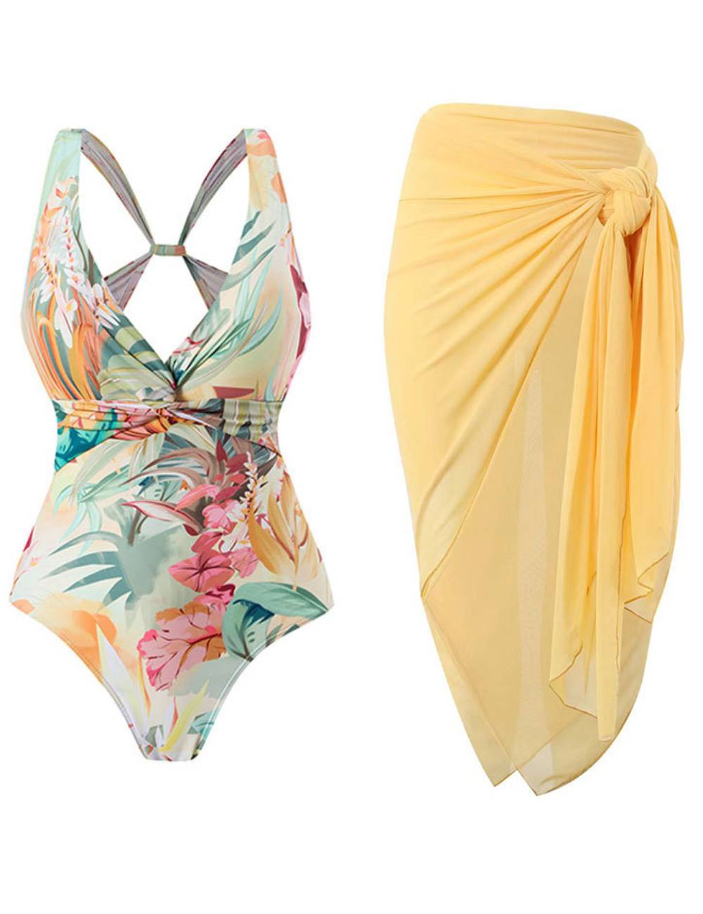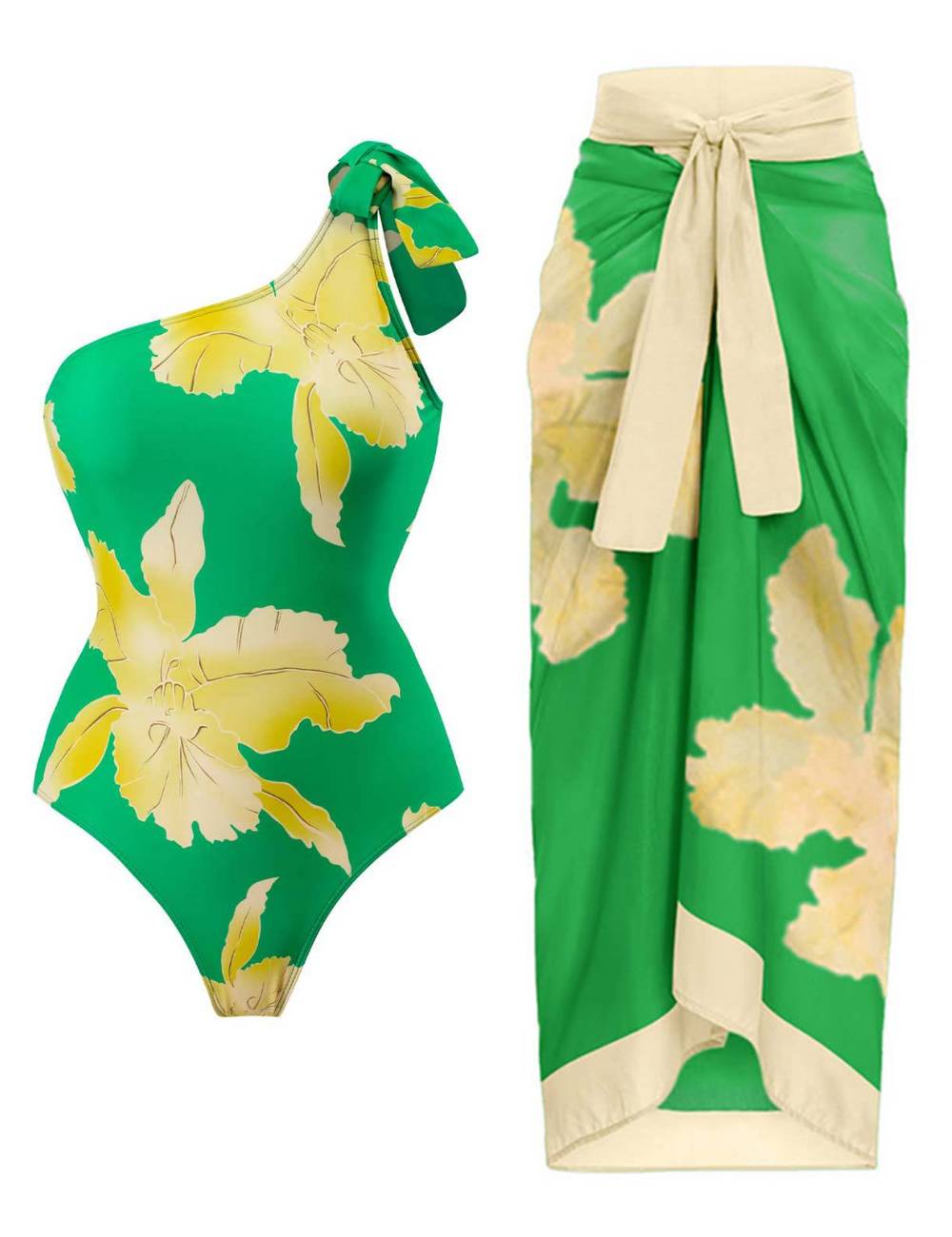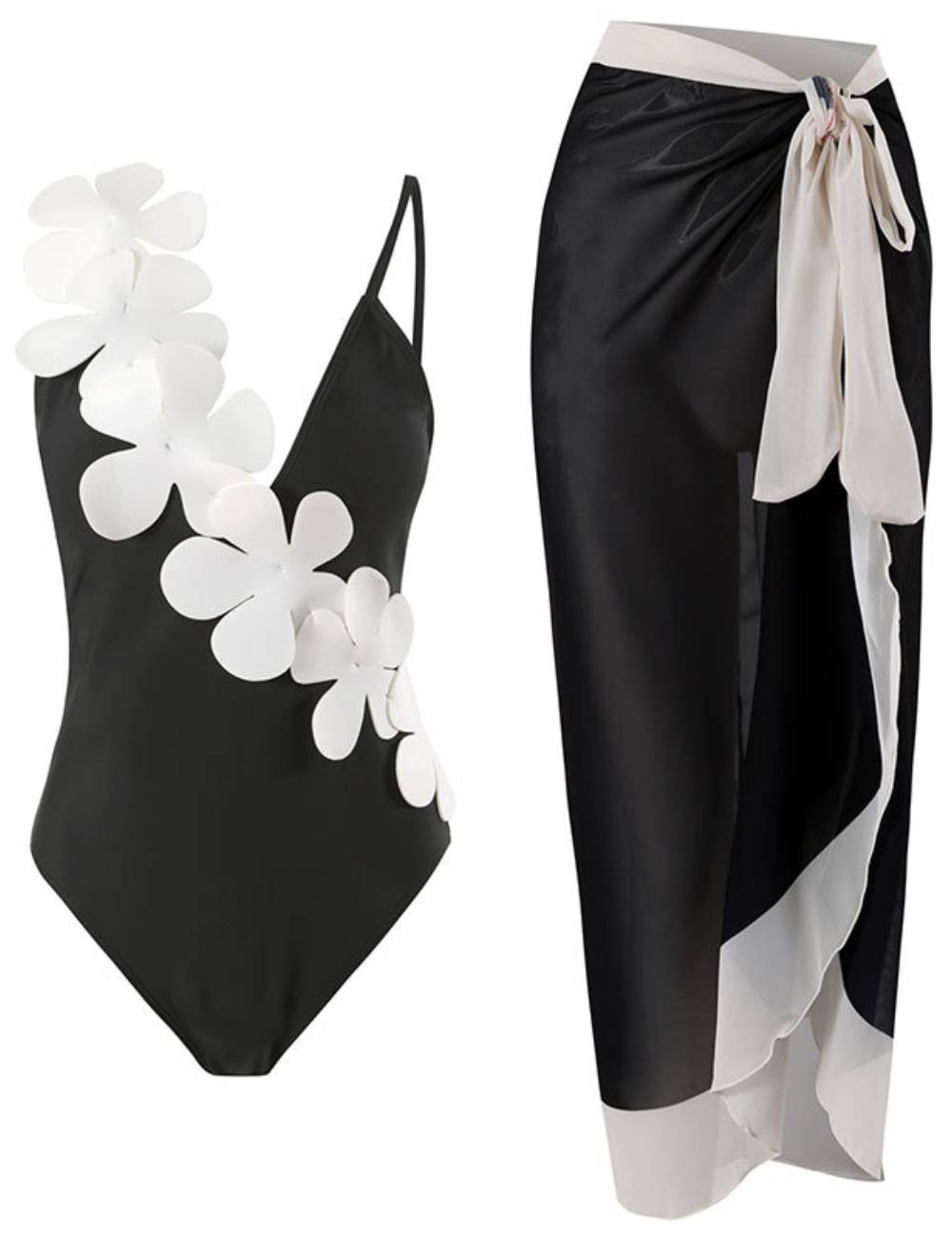 Flower Shoulder One Piece Swimwear 2PCS Set SKSW40141