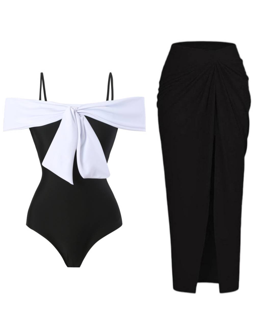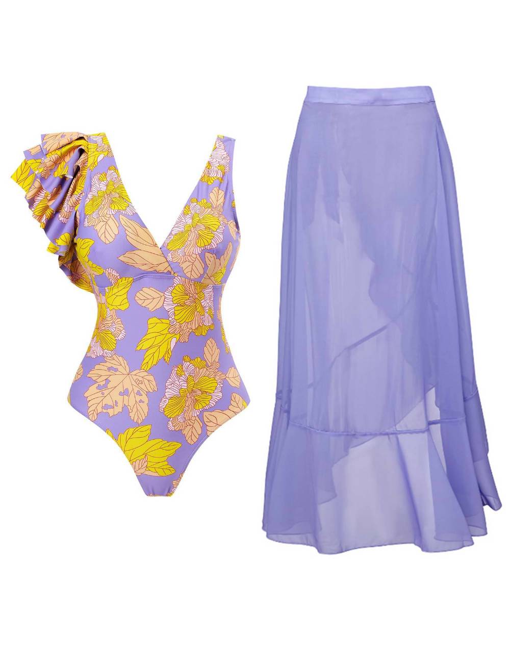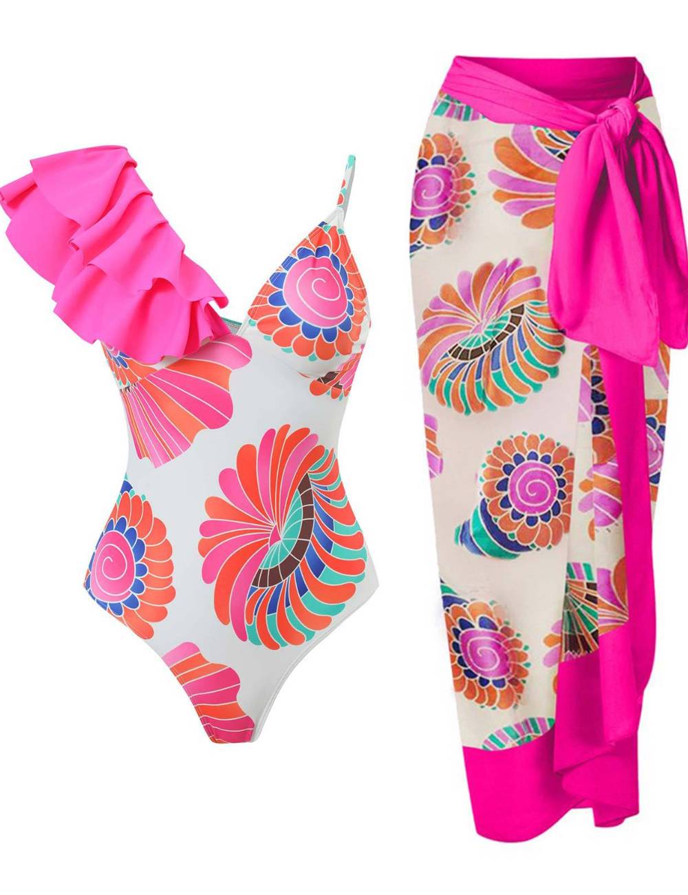 Flower Shoulder One Piece Swimwear 2PCS Set SKSW40141
