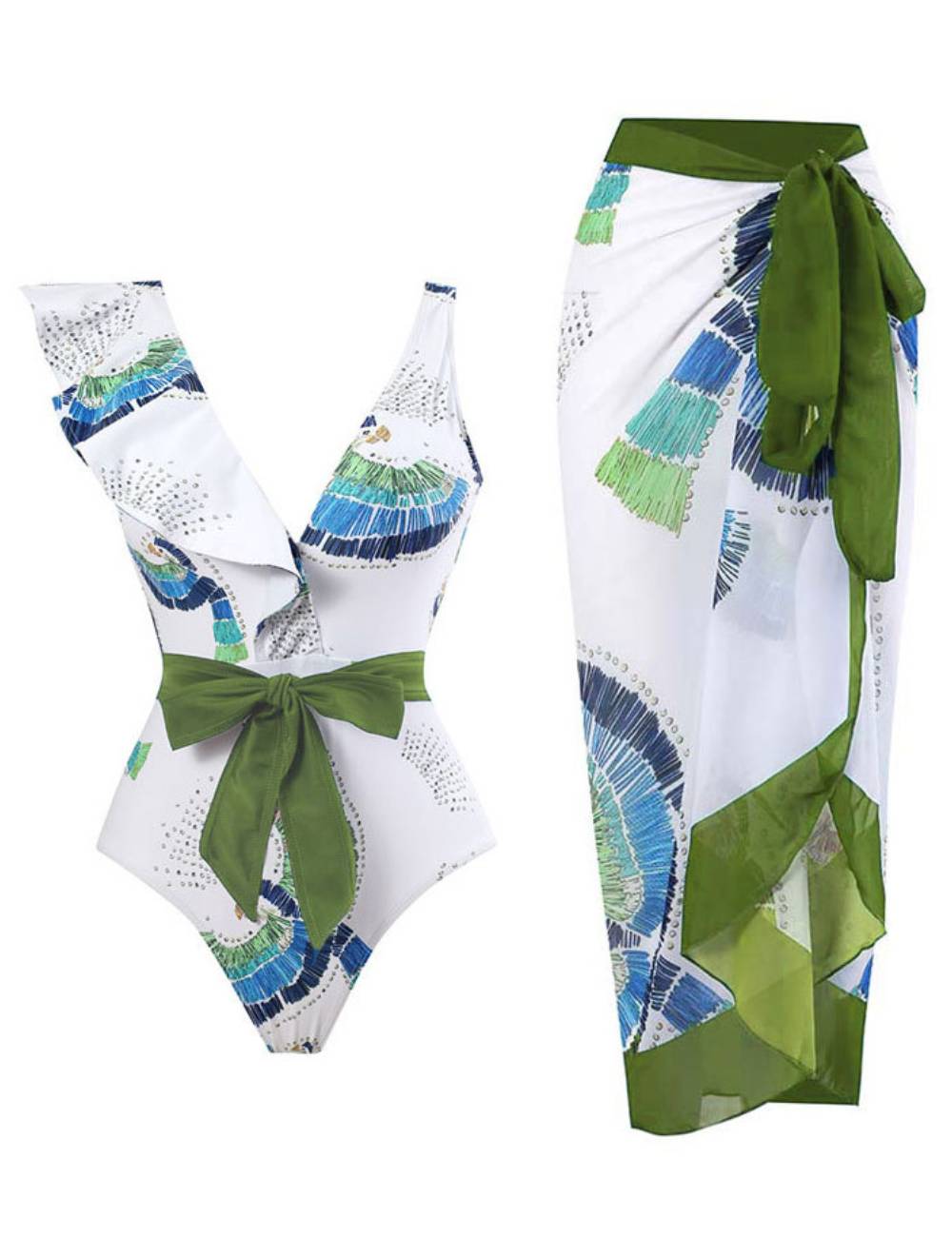Ruffle Shoulder Waist Tie One Swimwear with Cover SKSW40129