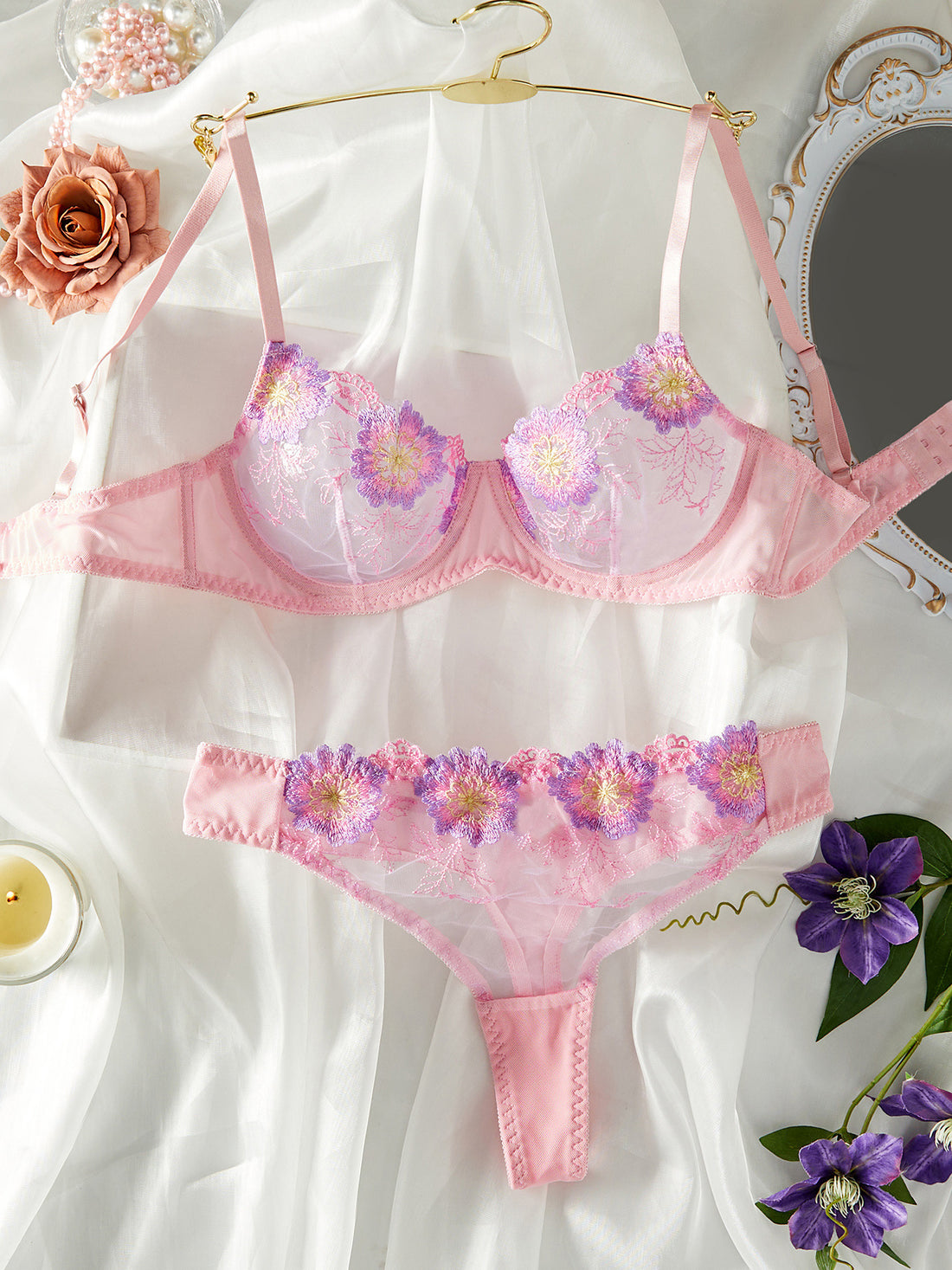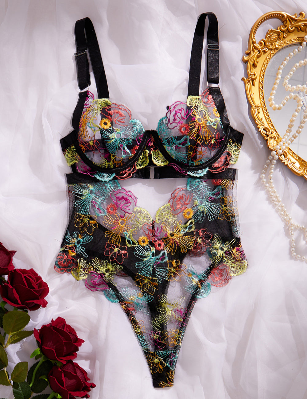 Ladies Floral Embroidery Color Block Lingerie Set SKLG4035