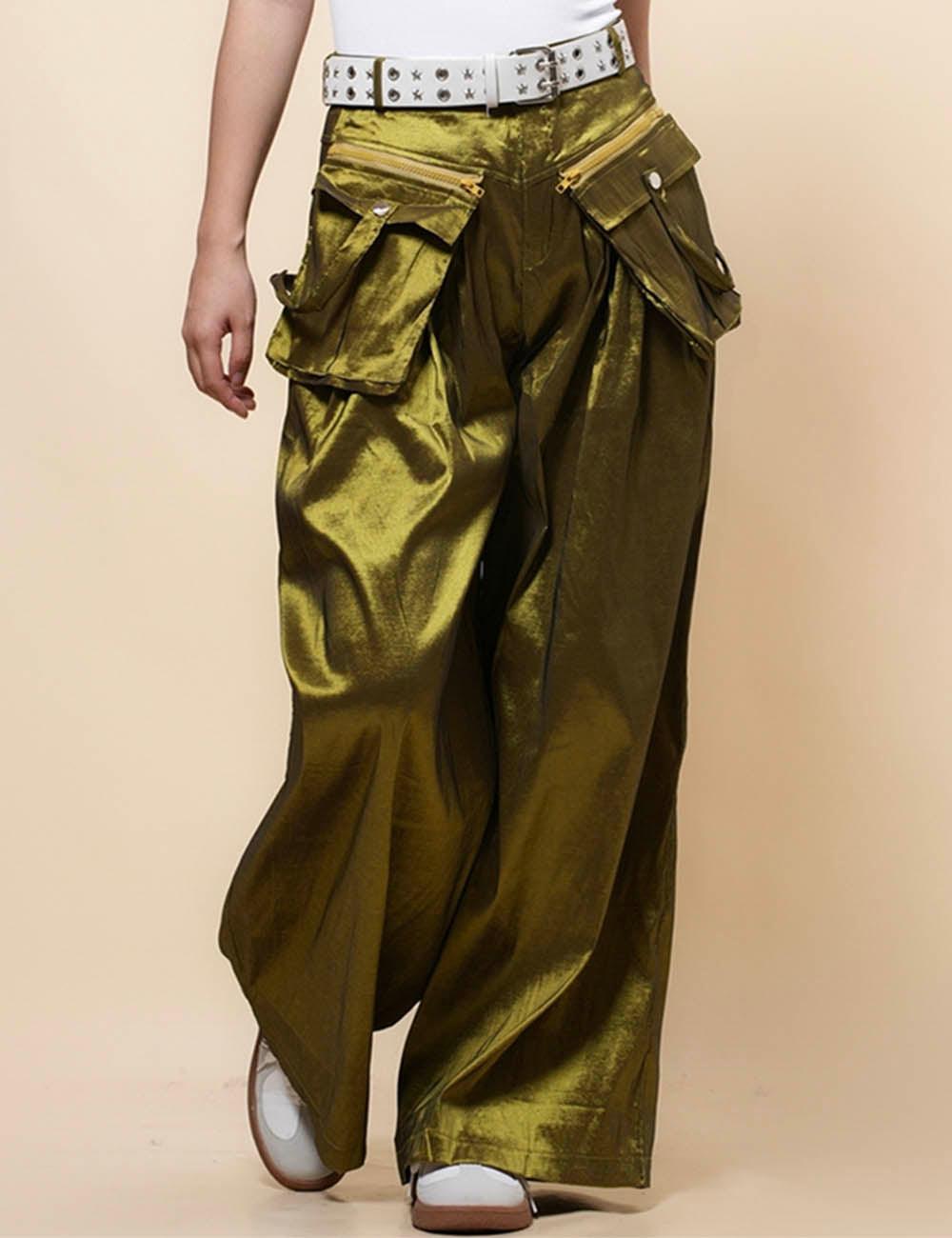 Ladies Solid Color Punk Light-reflecting Pockets Pants SKP4973