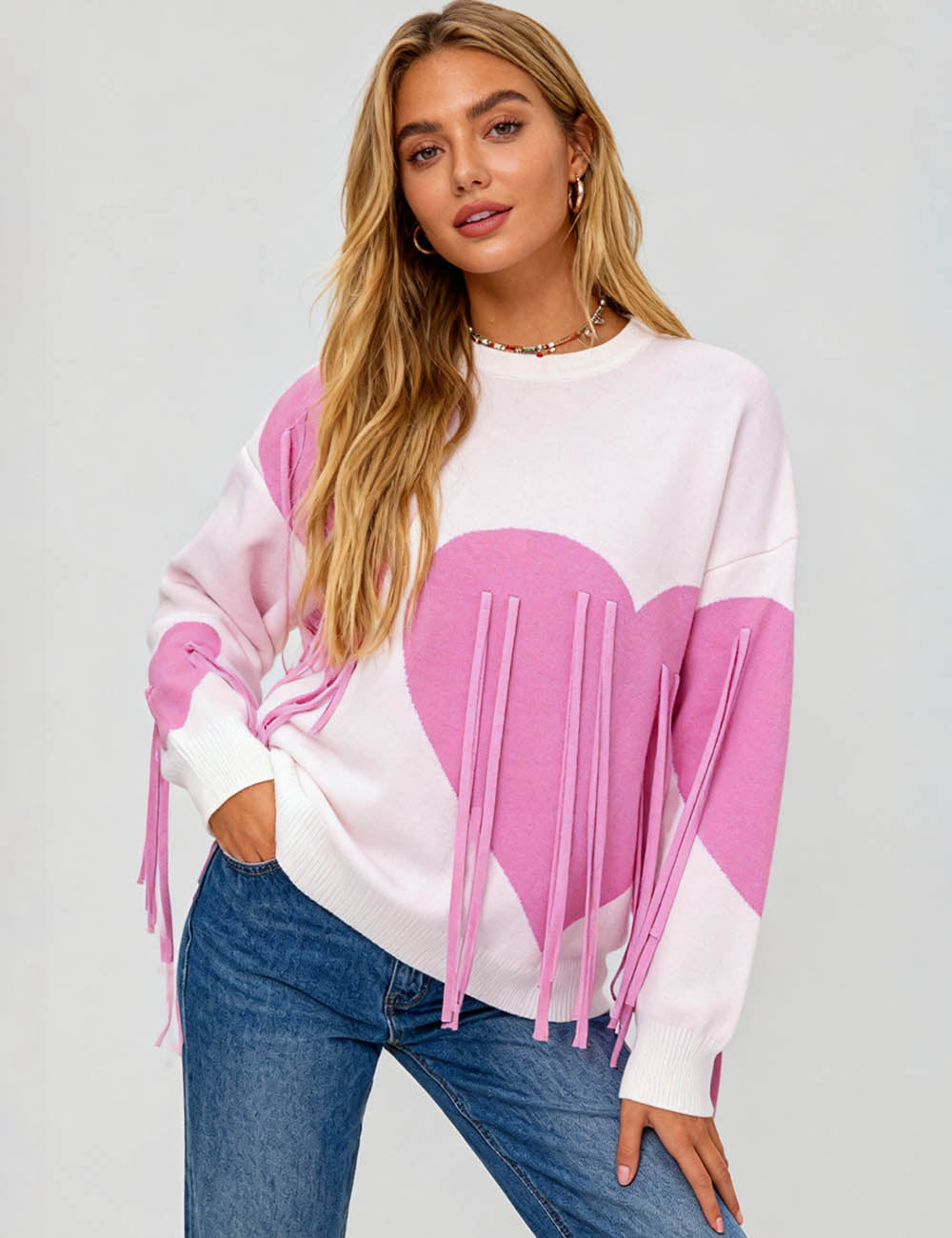 Ladies Valentine‘s Heart Pattern Round Neck Tassel Sweater