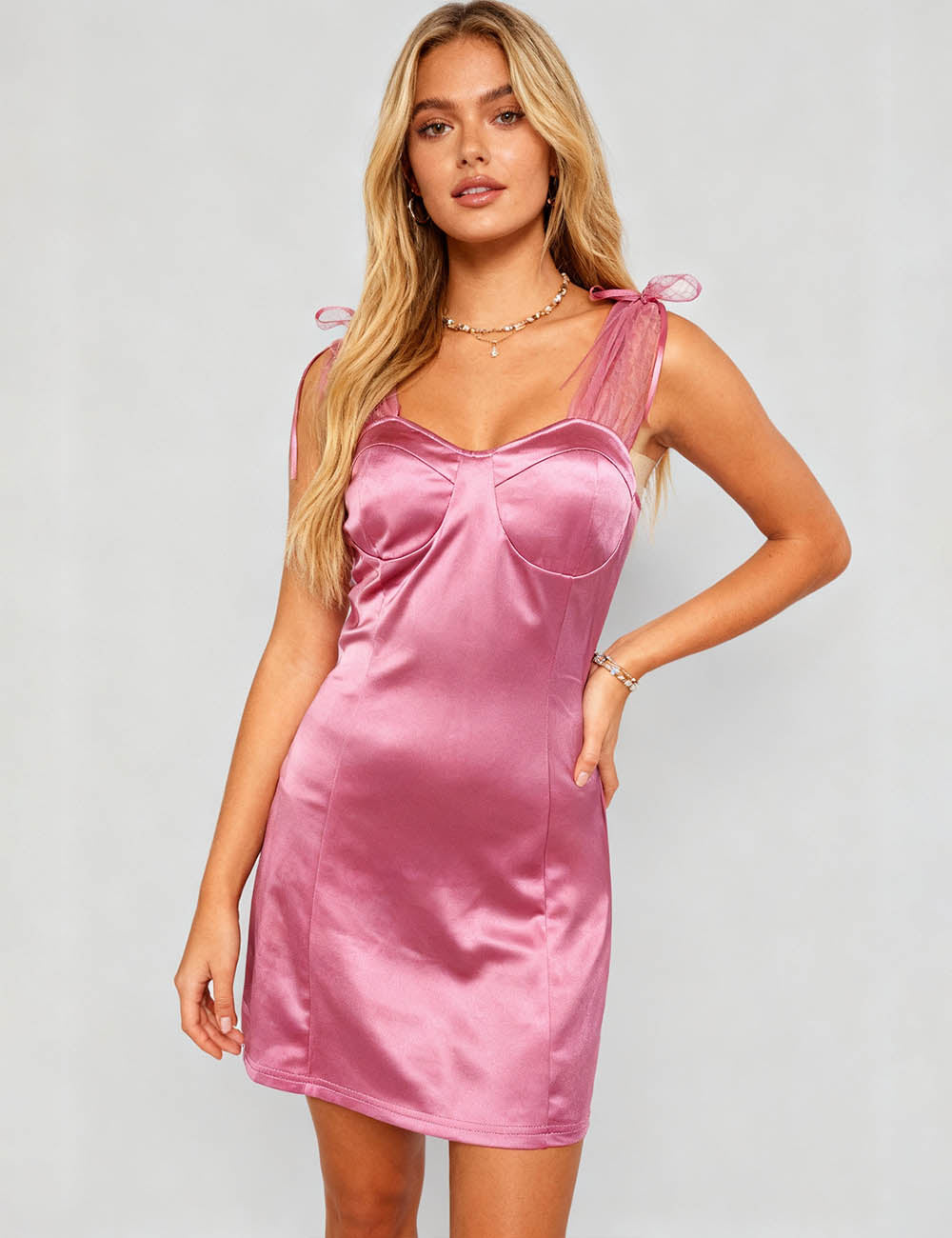 Ladies Satin Sweetheart Neckline Mesh Strap Shoulder Mini Dress