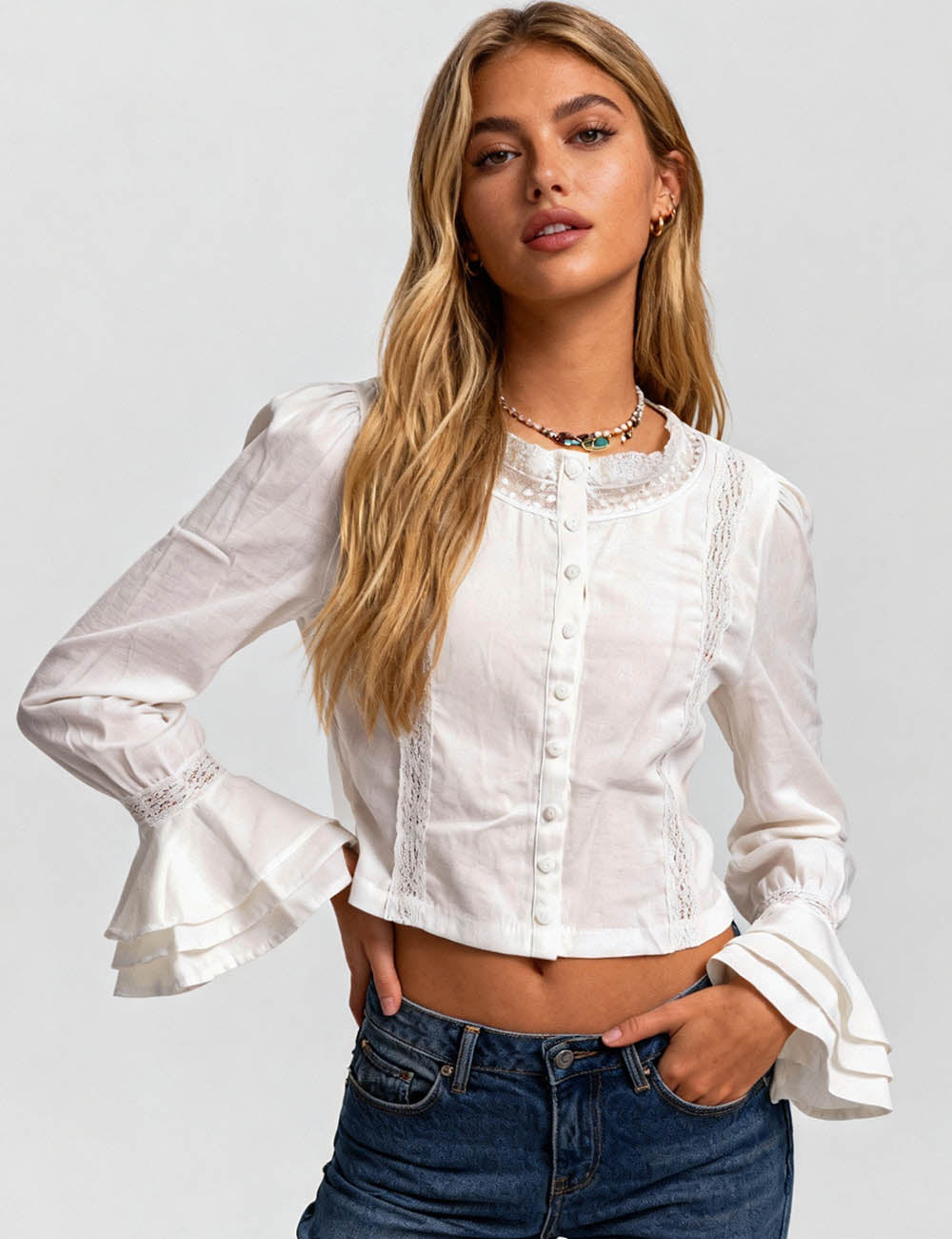 Ladies Sheer Lace V-Neck Long Sleeves Layering Top