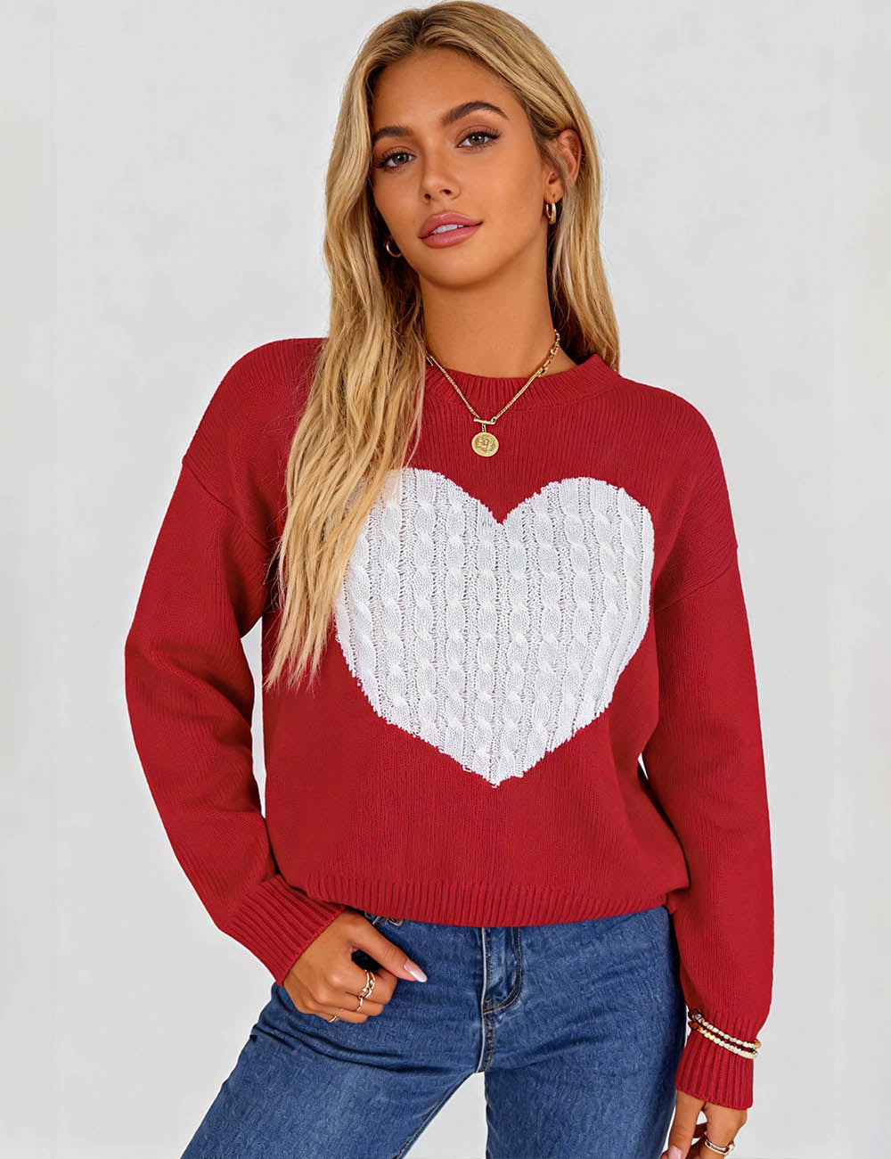 Ladies Valentine's Cable Heart Round Neck Pullover Sweater