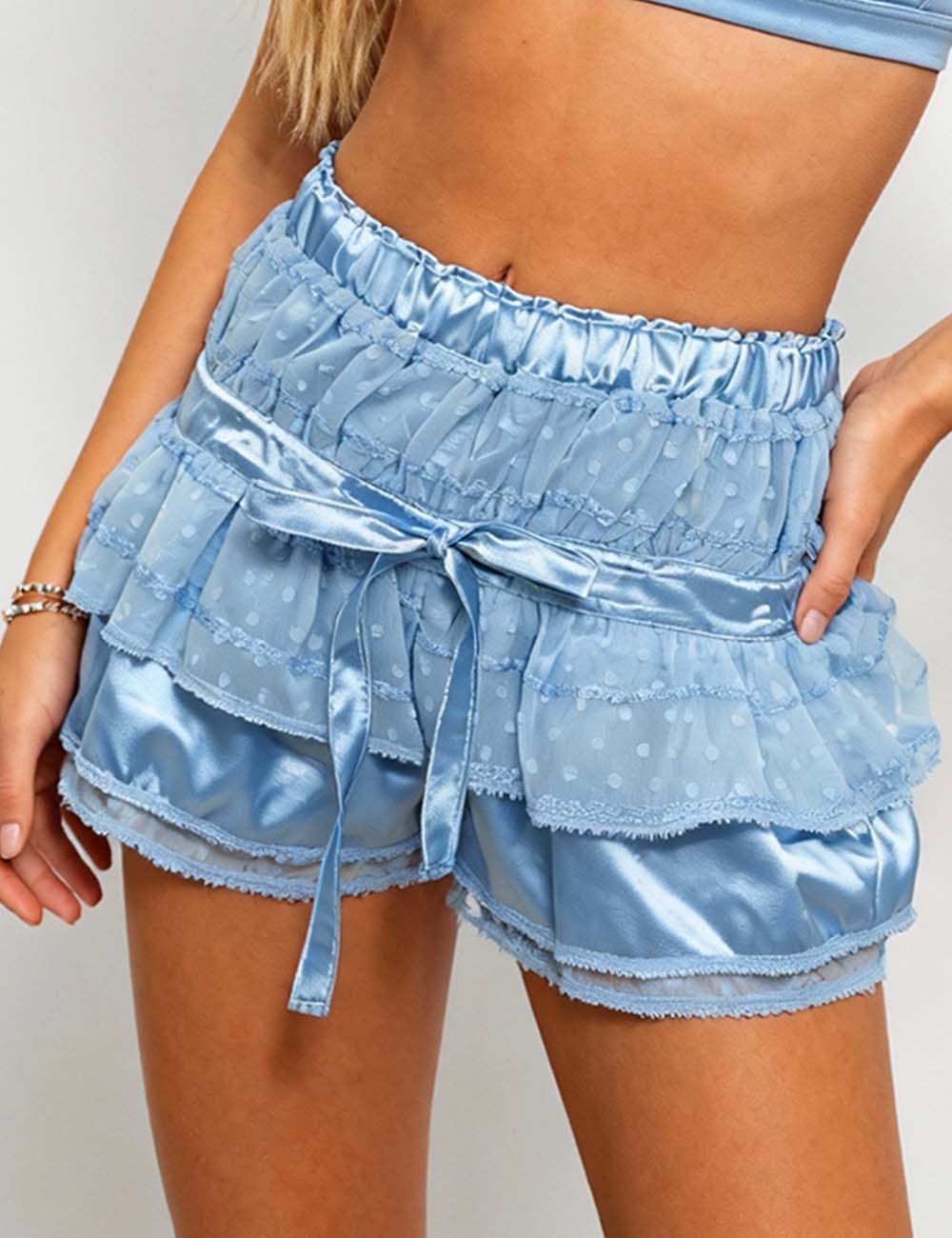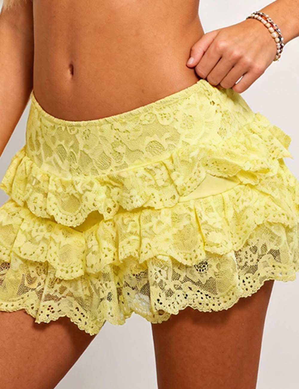 Ladies Solid Color Tiered Ruffle Lace Mesh Mini Shorts