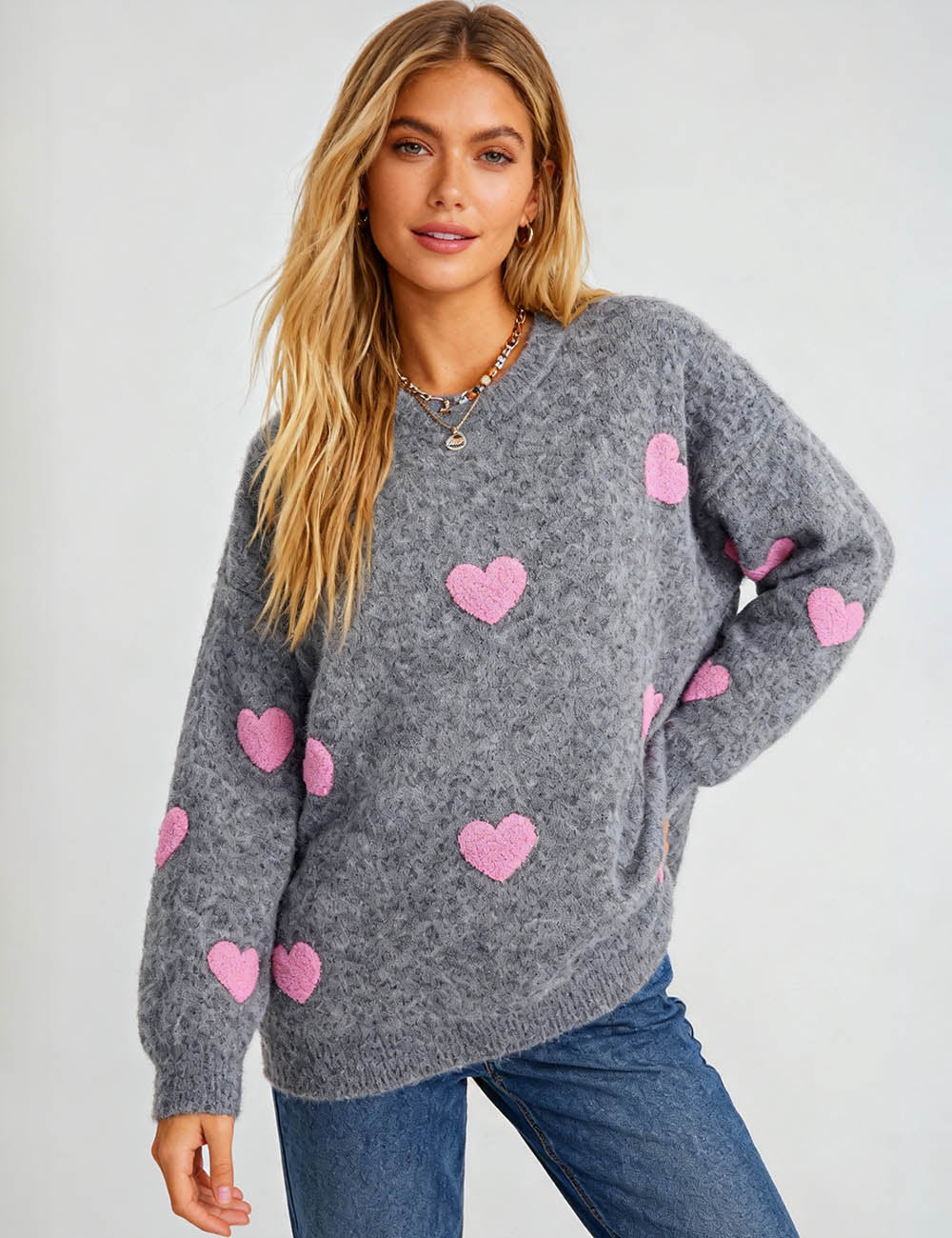 Ladies Valentine‘s Multi Color Heart Round Neck Sweater