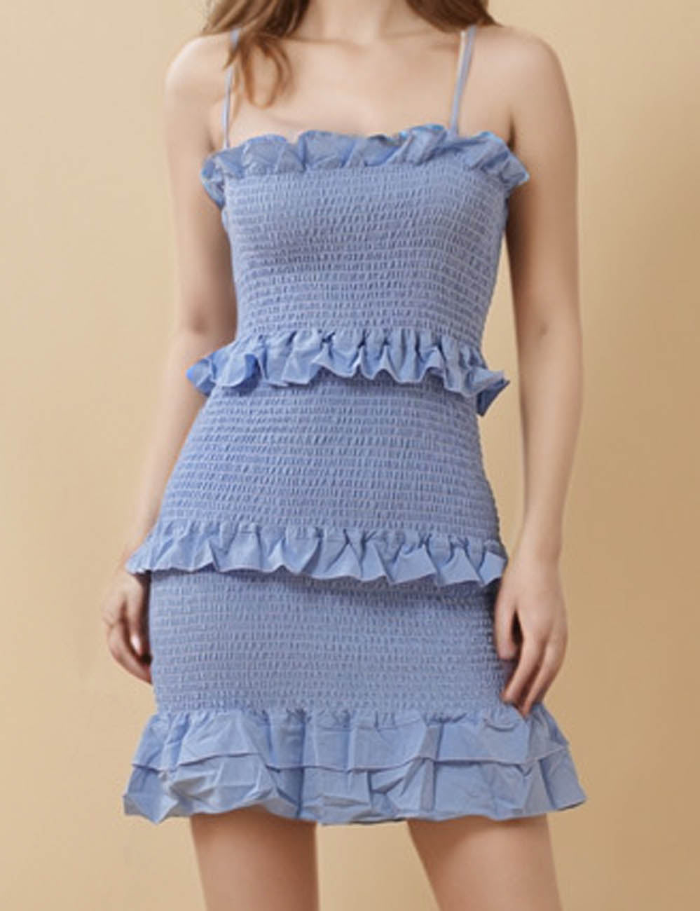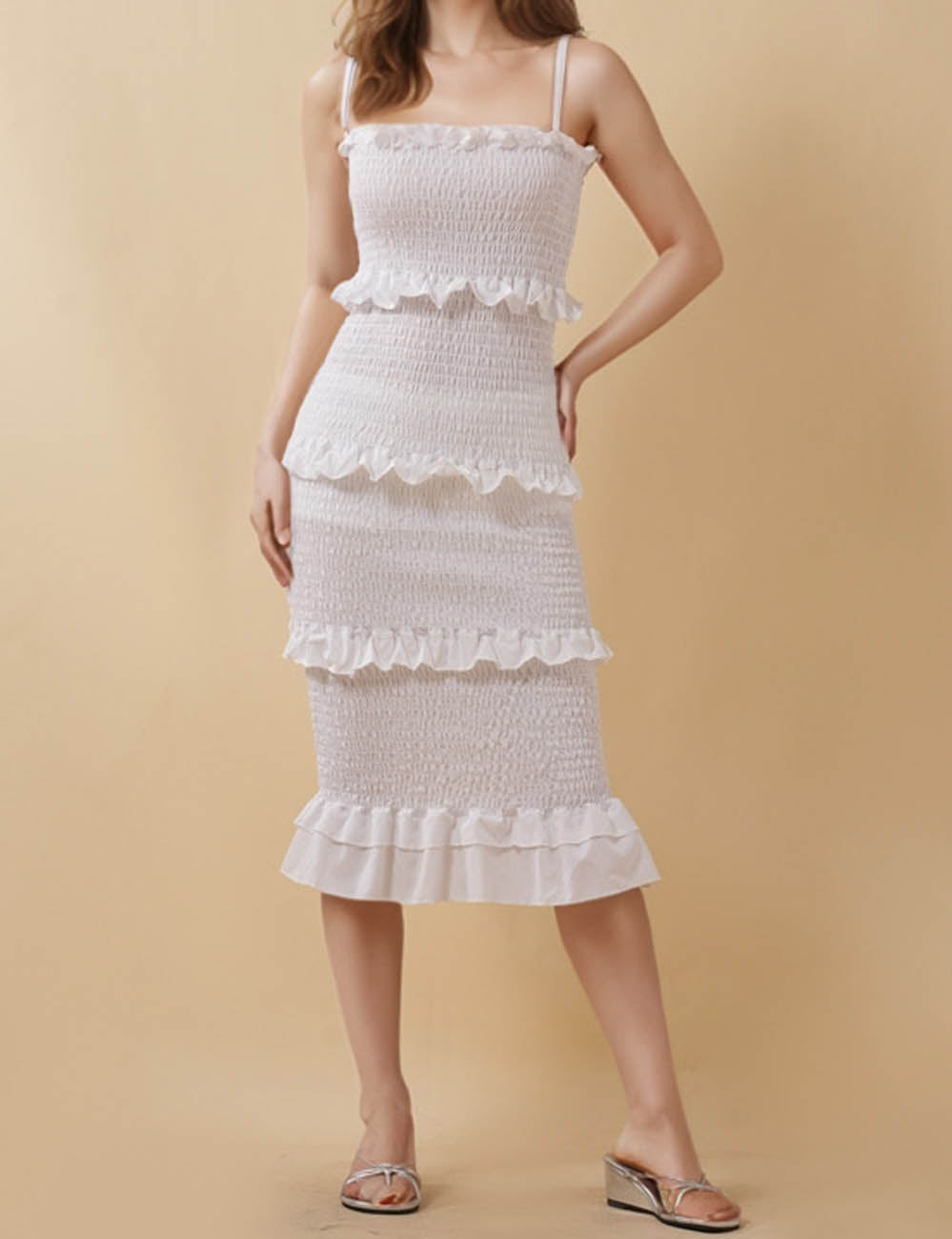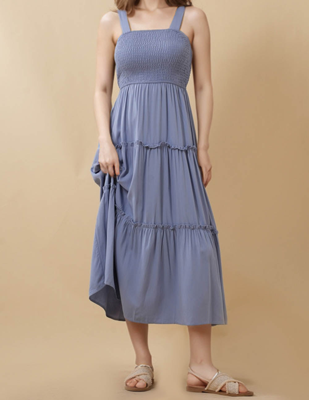 Ladies Solid Color Smocking Ruffle Strap Shoulder Midi Dress