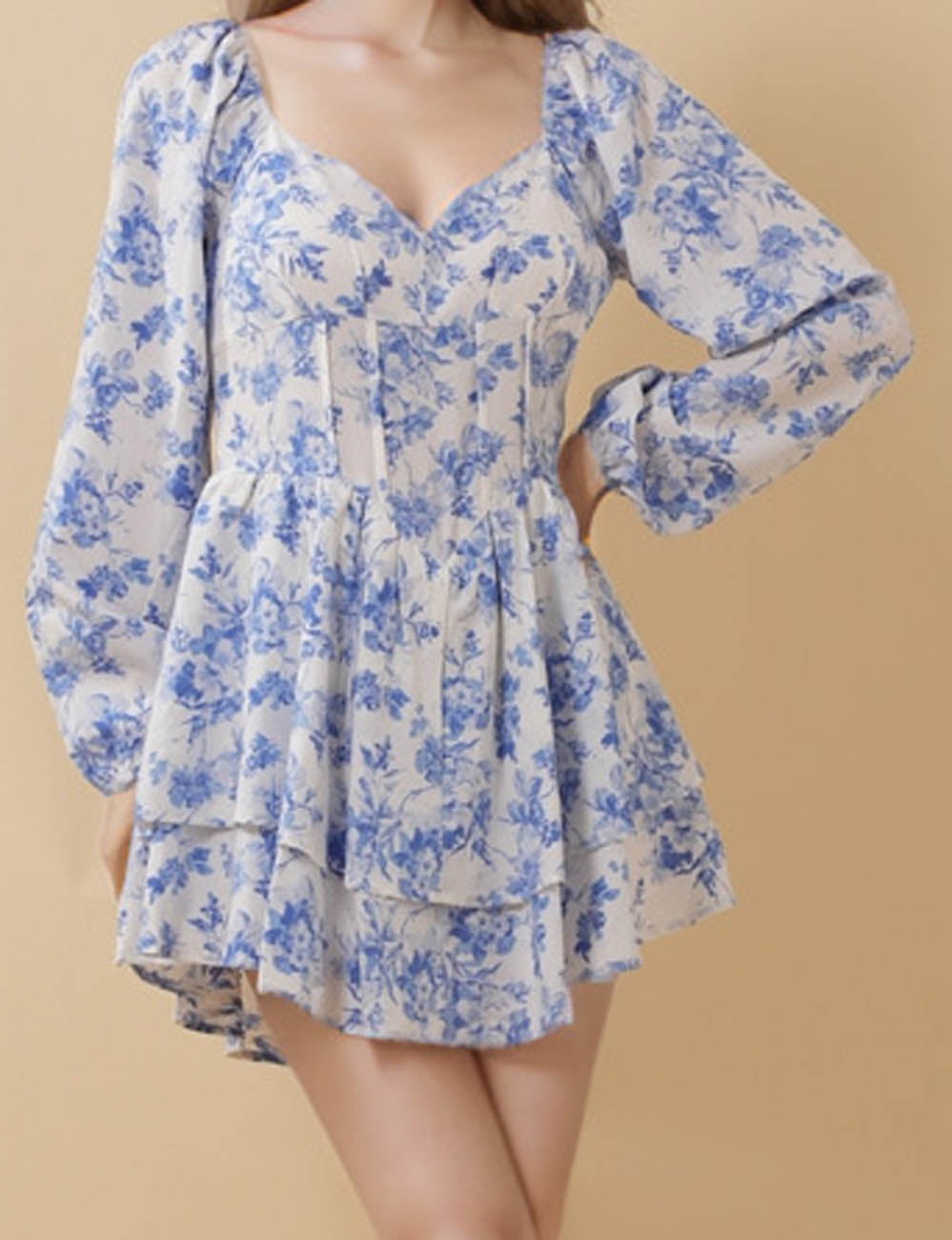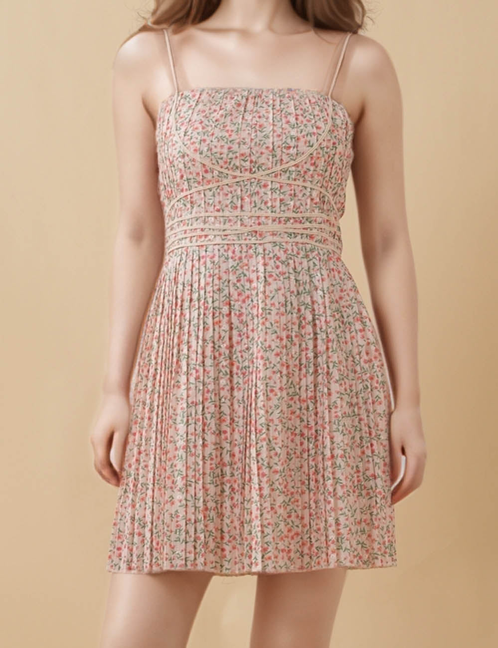 Ladies Square Neck Floral Print String Shoulder Pleated Mini Dress