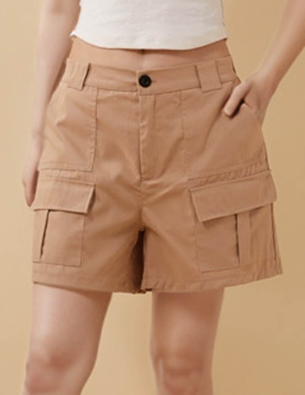 Ladies Solid Color String Tie Pocket Straight Leg Shorts