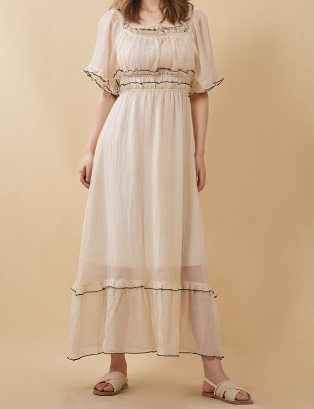 Ladies Color Block Ruffle Elastic Waist Short Sleeves Maxi Dress