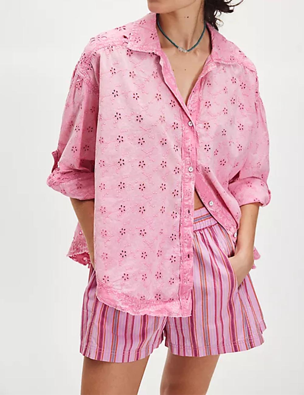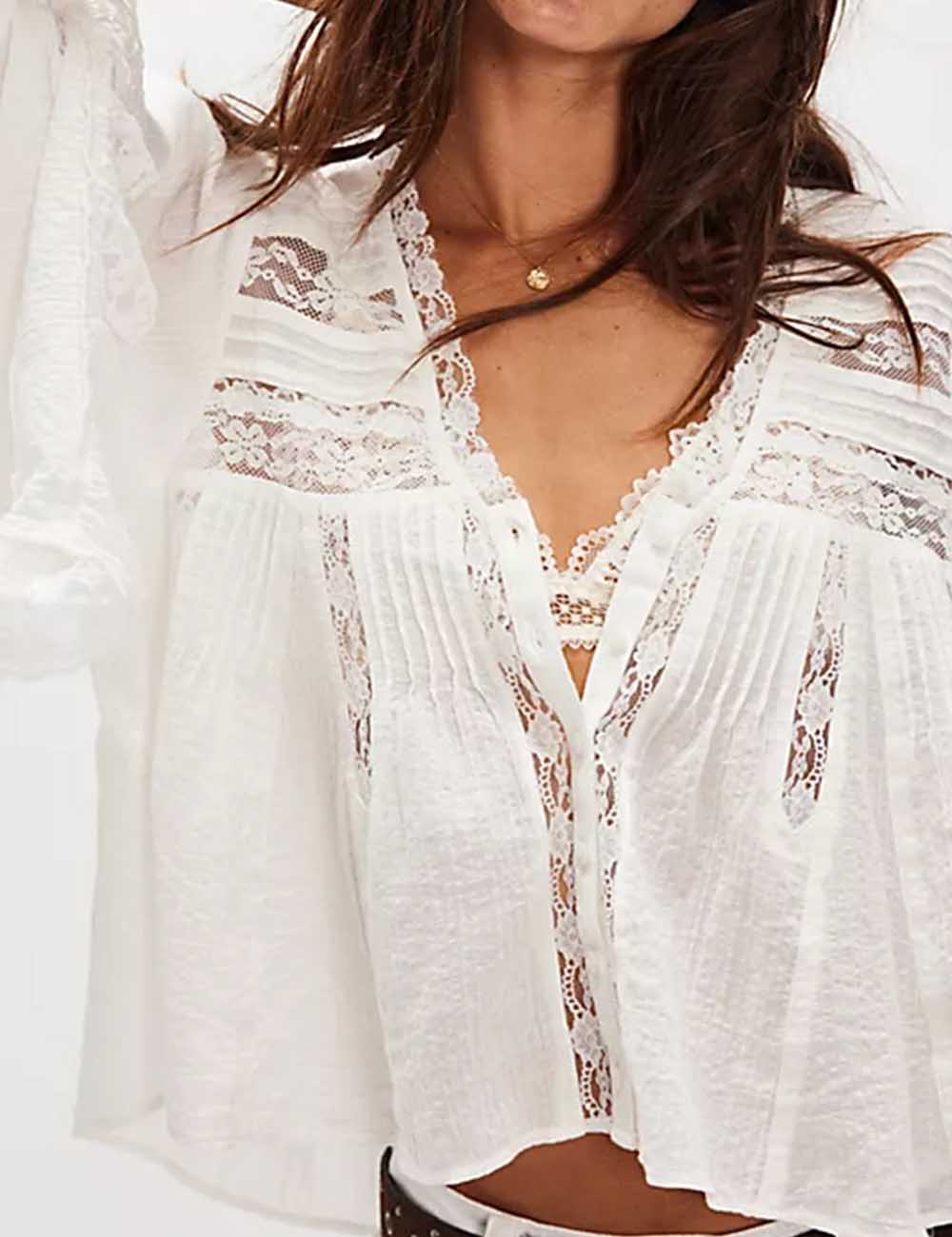 Ladies Solid Color Eyelets Long Sleeves Shirt