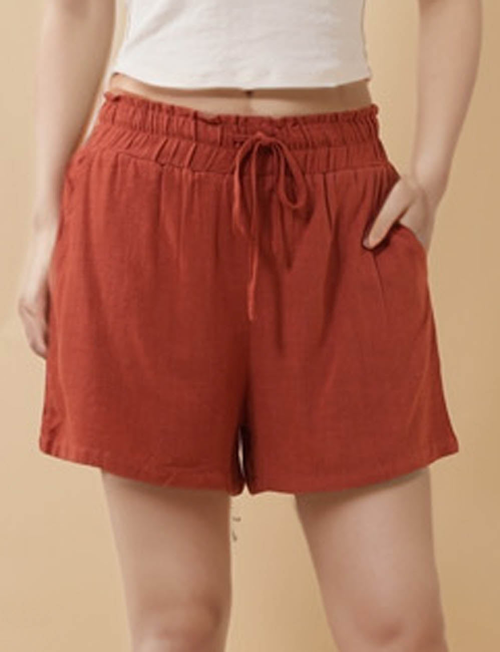 Ladies Solid Color Elastic Waist Drawstring Pocket Shorts