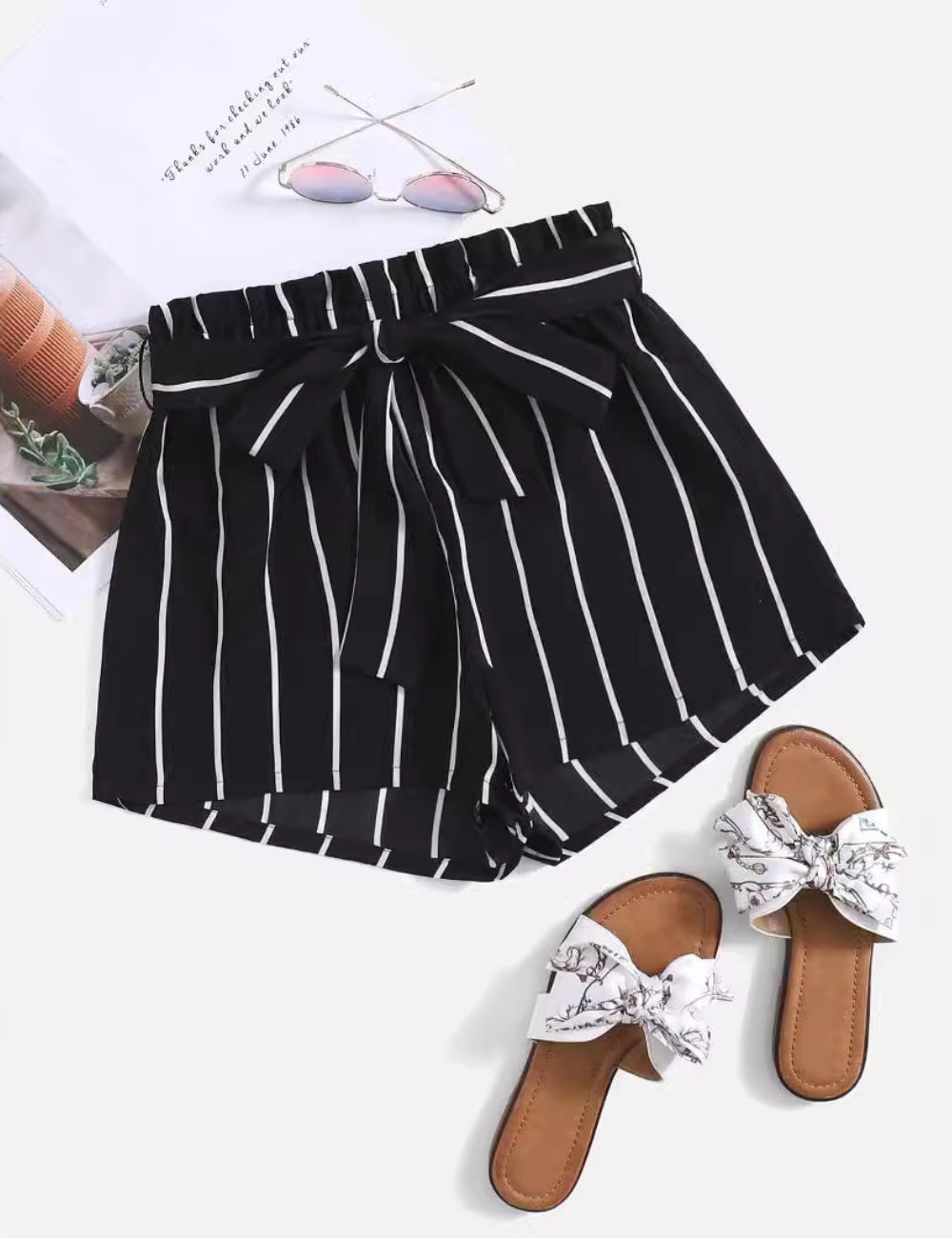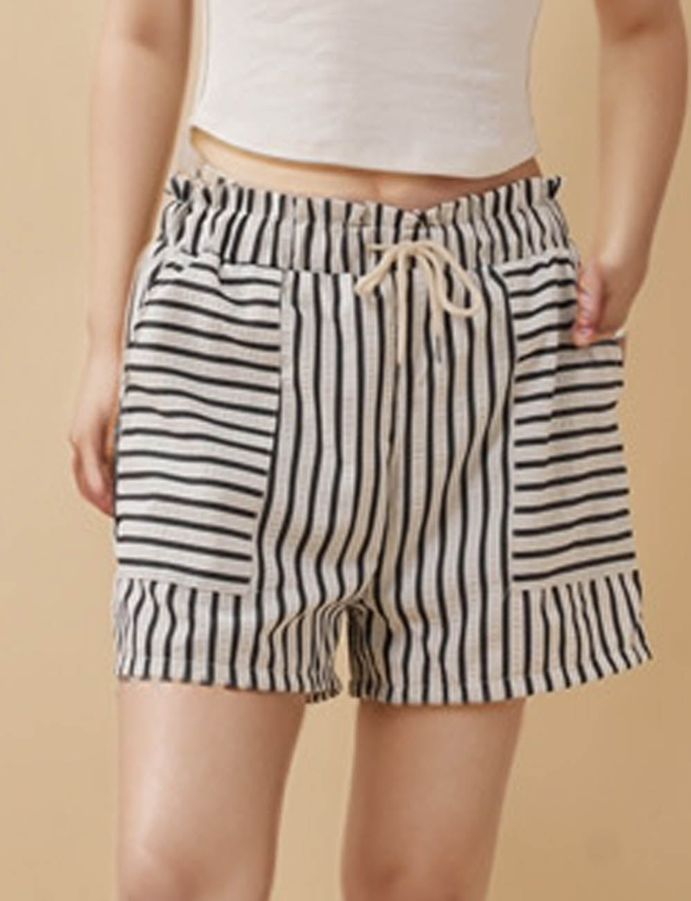 Ladies Color Block Elastic Waist String Tie Striped Shorts