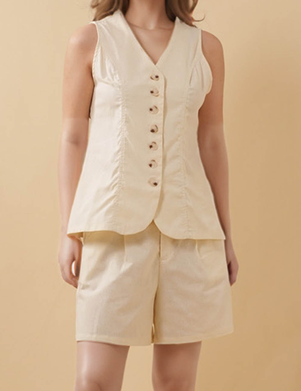 Ladies Solid Color V-Neck Button Sleeveless Vest Top & Shorts